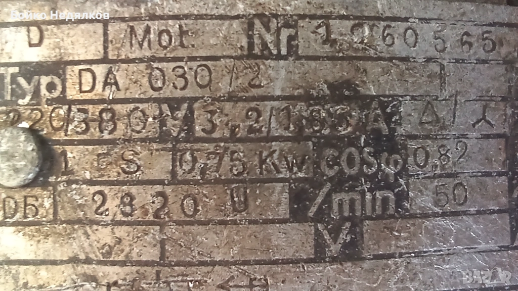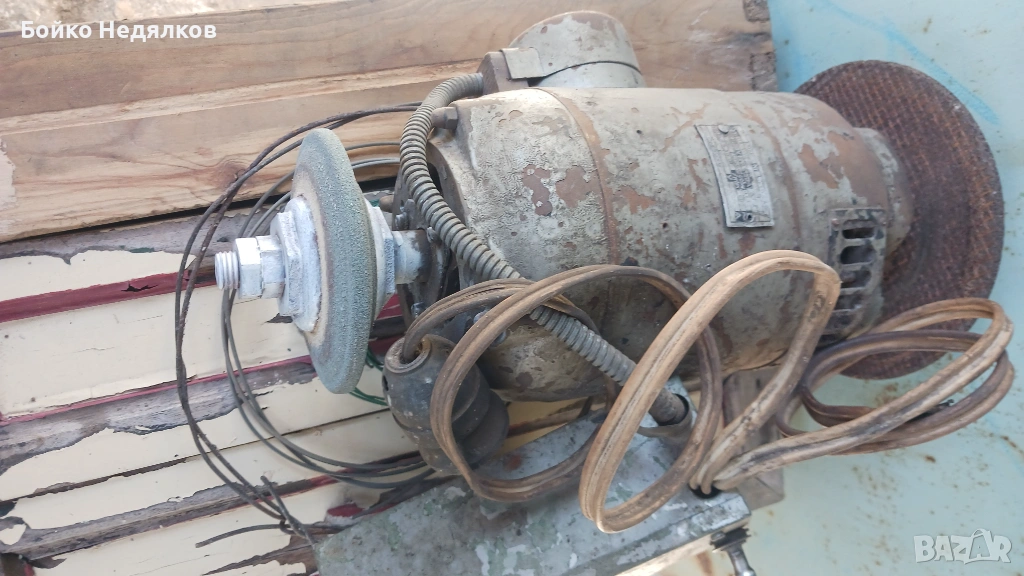 Напълно изправен, ползвал съм го дълги години, но вече не ми е нужен. Двигателят е трифазен, (3 х 380 В), пресвързан за монофазен, (230 В, с кондензатори). Мощност 0,75 кВт, обороти 2830 мин-1. Оригинално е с фланцово закрепване, като са изработени ''пети". Производство 1981 г. (вероятно). Диаметър на двата работни края на вала на ротора - 16 мм. С лява и дясна резба. Налични шайби и гайки, съответно също с лява и дясна резба за ключ 24 мм. Тегло 14,5 кг. Подчертавам, че няма капаци на камъните, както и прозрачни екрани. Лагерите са с повишен шум. Лично вземане от гр. София, кв. "Малинова долина".