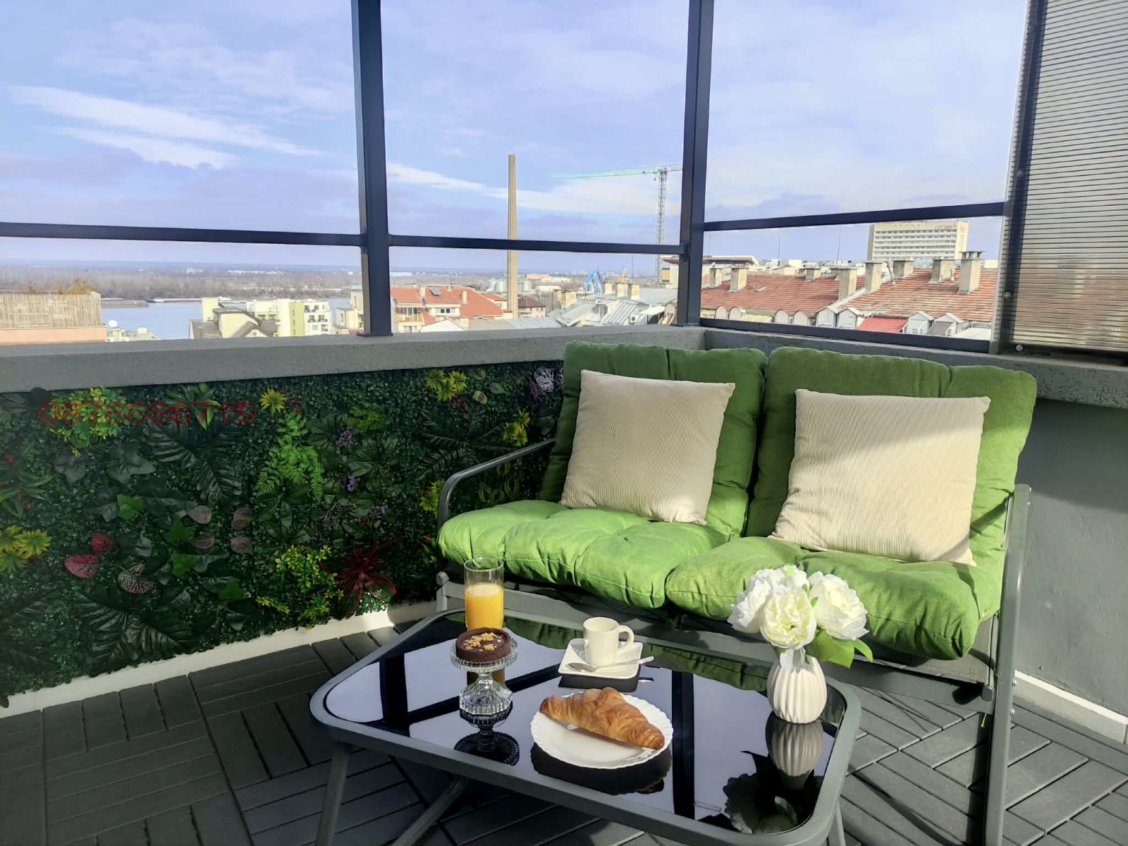 Жилището се отличава с уникална 180 панорамна гледка към река Дунав,ул.Александровска и града, която се разкрива от просторна тераса идеално място за отдих и релакс.