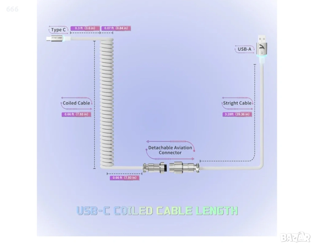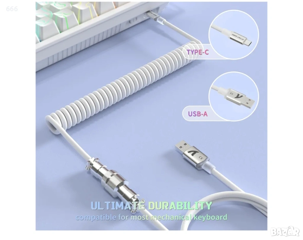 USB-C към USB-A порт: Спираловидният кабел за клавиатура с USB-C към USB-A порт позволява бързо зареждане и бърз трансфер на данни. Идеален за непрекъснато захранване и синхронизация на вашите устройства. Съвместим с повечето механични геймърски клавиатури с USB-C.