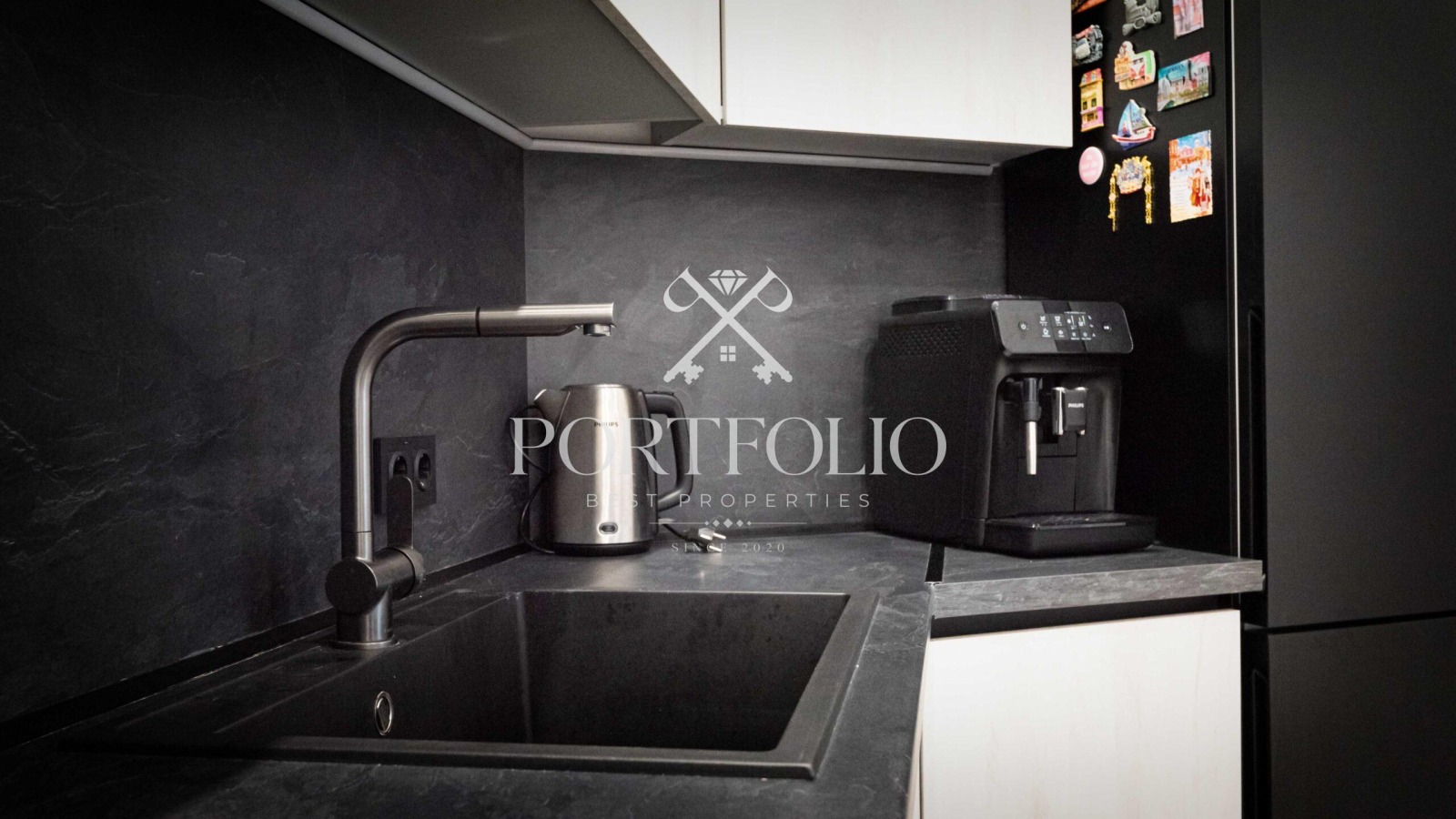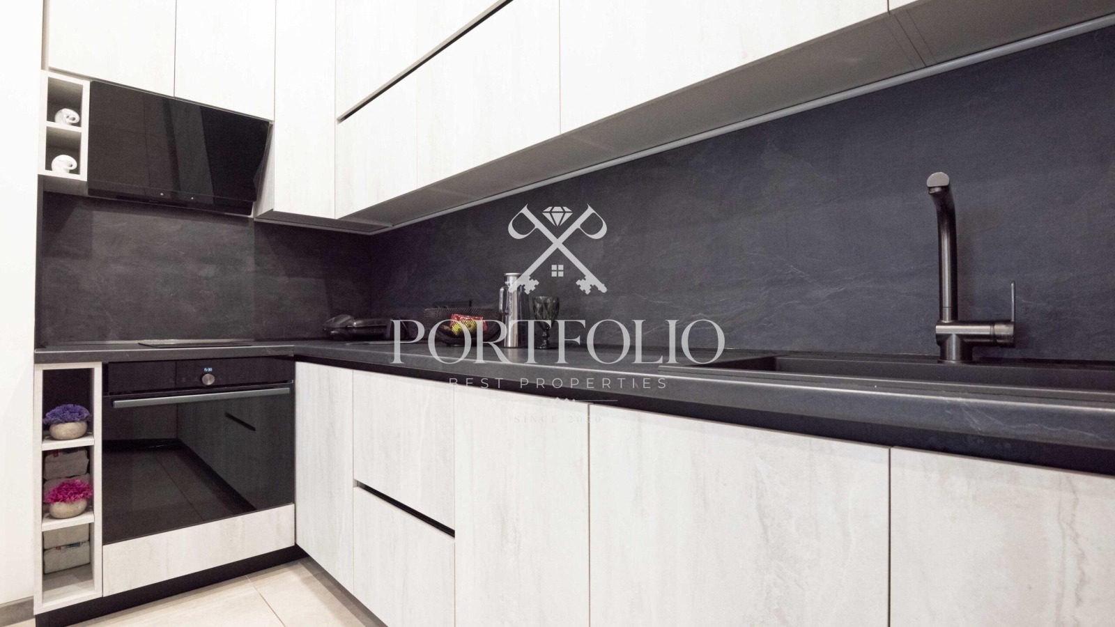 Апартаментът впечатлява с луксозна архитектурна планировка - просторна всекидневна и широка, комфортна спалня. Високи прозорци френски тип с алуминиев профил дограма цвят антрацит. Височина на тавани 3.10м. Интериорът е с индивидуален дизайн, а мебелите са изработени специално за имота.