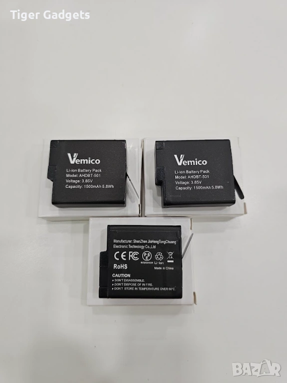 Vemico комплектът включва 3 броя батерии по 1500 mAh и 3-канално зарядно устройство, съвместими с GoPro Hero 7, Hero 6, Hero 5 и Hero 2018. Идеално решение за по-дълго снимане без прекъсване.