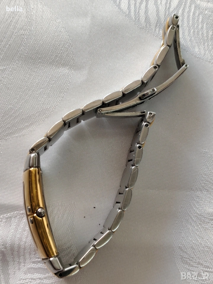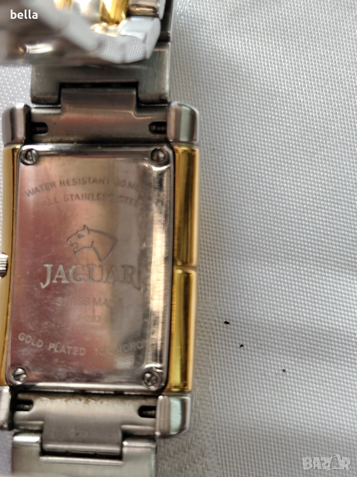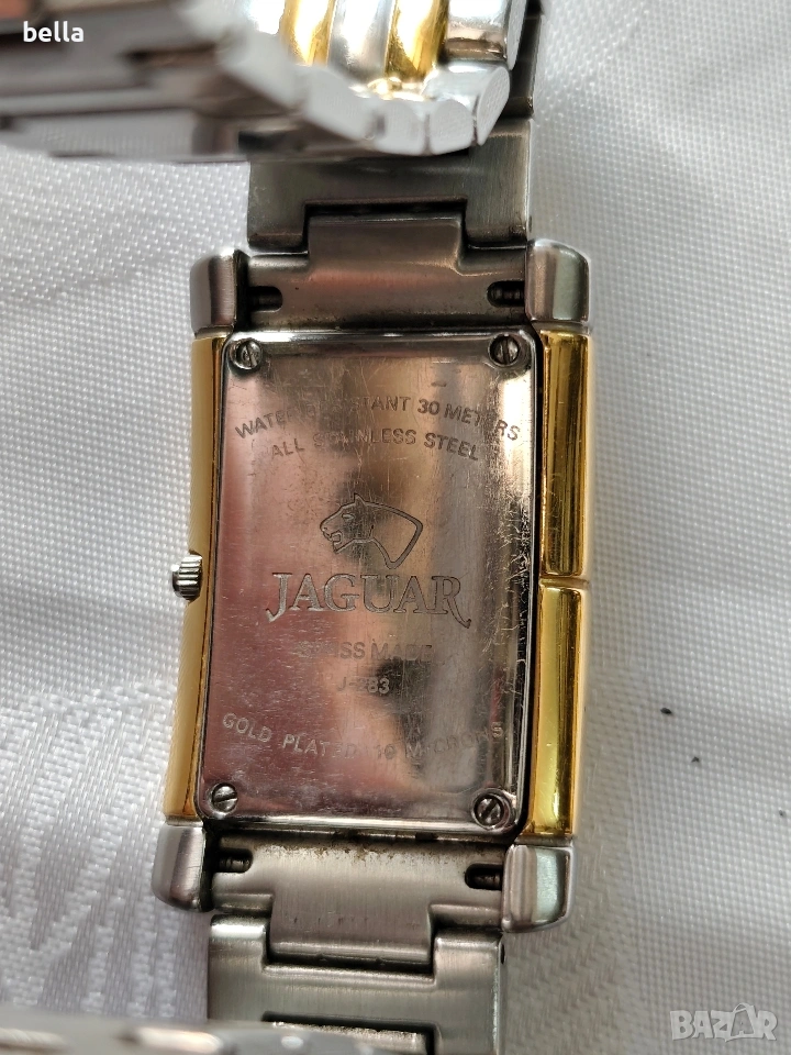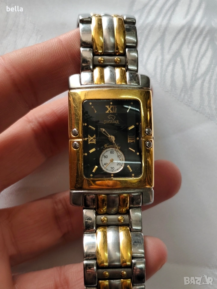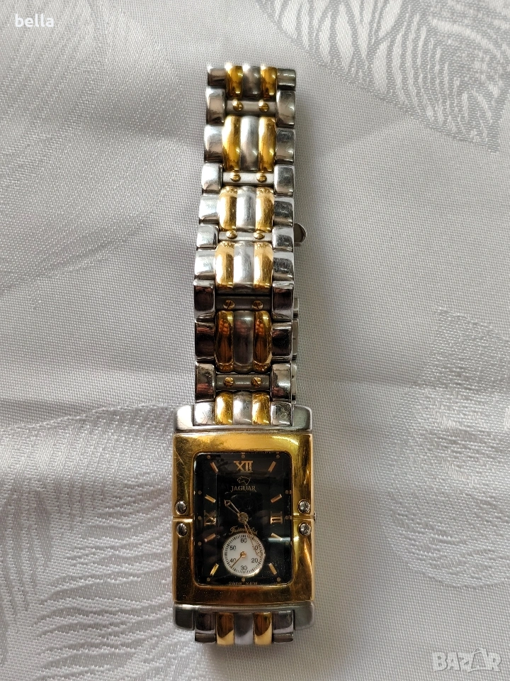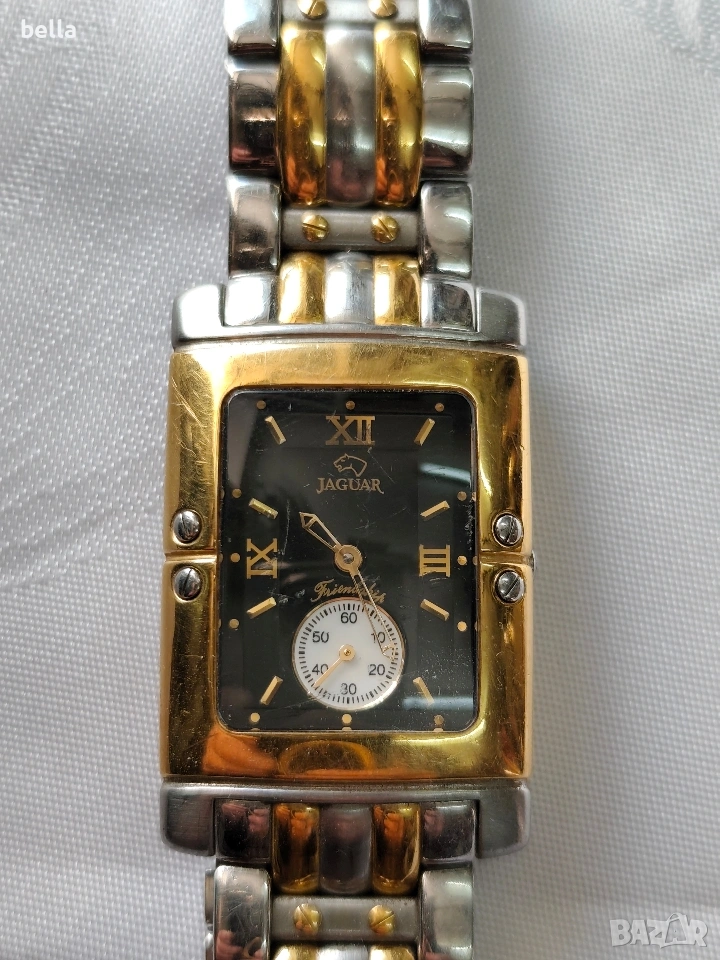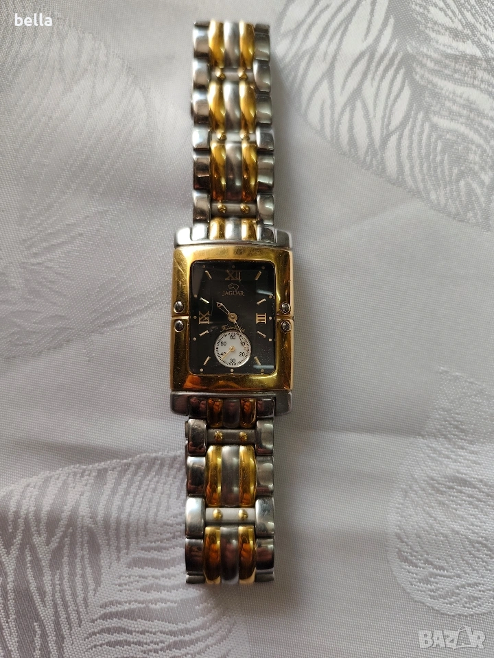 Мъжки кварцов часовник Jaguar J283 от неръждаема стомана, позлатени часови маркери тип „батон“ и римски цифри, позлатени скелетонизирани стрелки, вторичен секунден циферблат на 6, към верижка от неръждаема стомана и закопчалка тип „пеперуда“позлатена верижка запазен като цяло видно е и от снимките леки драскотини по циферблата които могат да се полират.Цена 80 евро