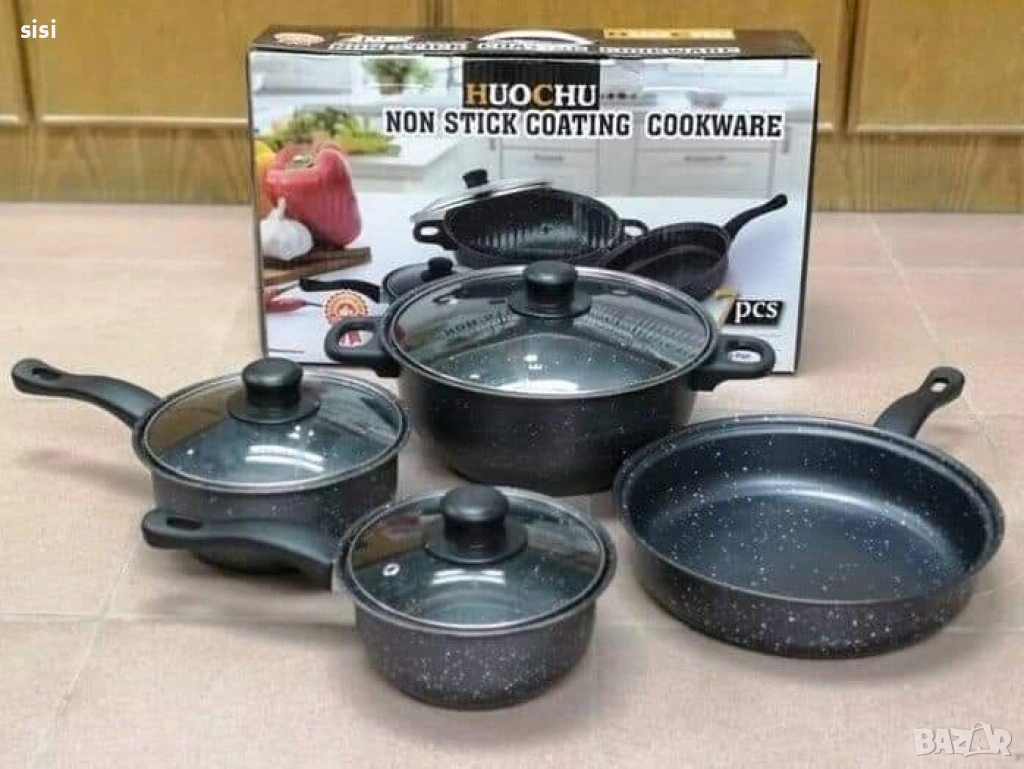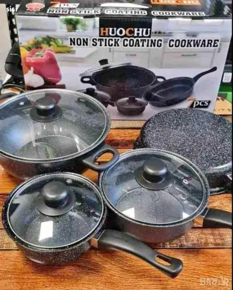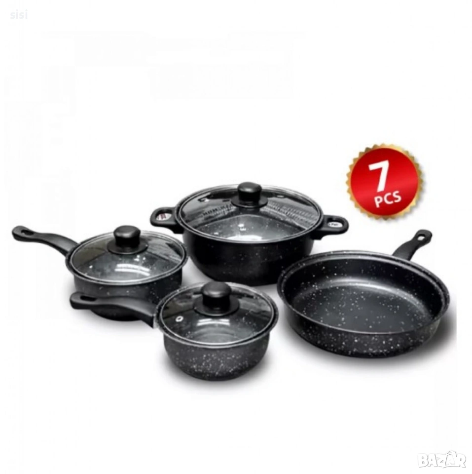 Комплект качествени тенджери от 7 части с незалепващо мраморно покритие. ? Обновете своята кухня с нашия комплект от 7 качествени тенджери с елегантно мраморно покритие, което не залепва! ? Практичен и стилен набор за перфектно готвене. ??✨