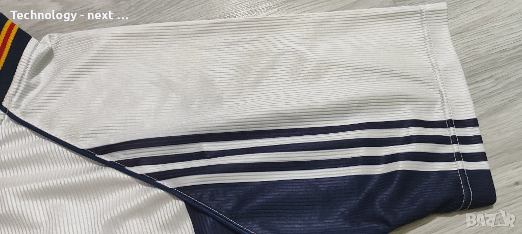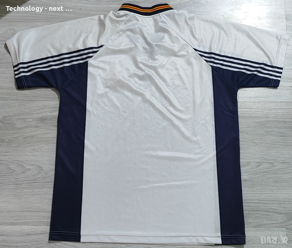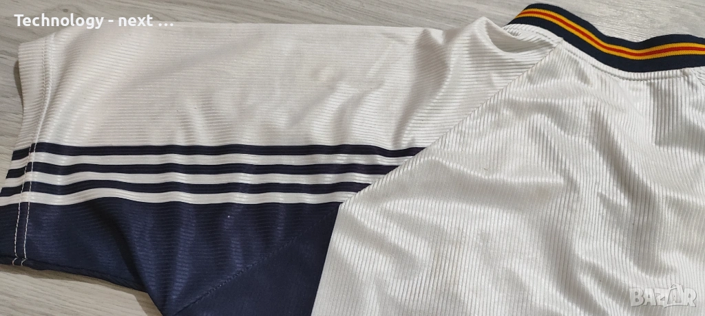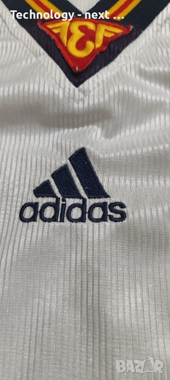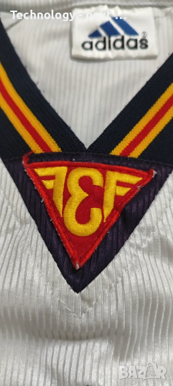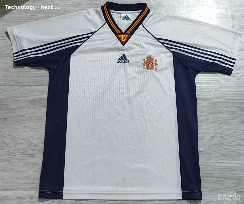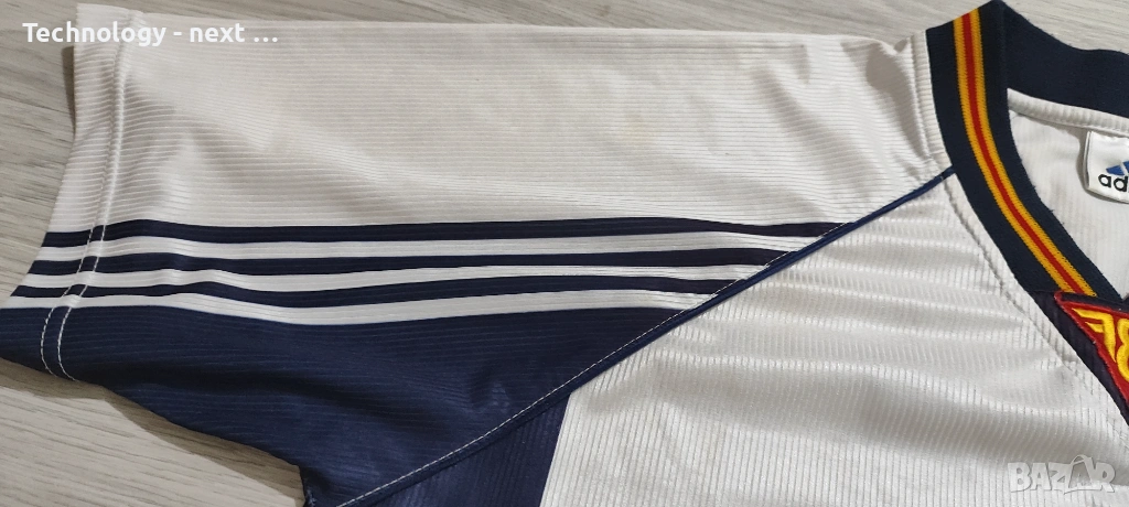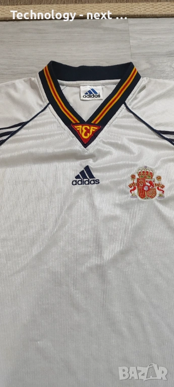 Автентична гостуваща фланелка на националния отбор на Испания от периода 1994 – 1996 г. Моделът е произведен от Adidas и е истинска класика от 90-те години.