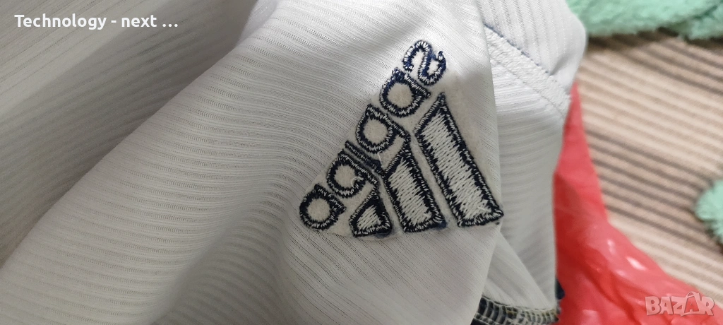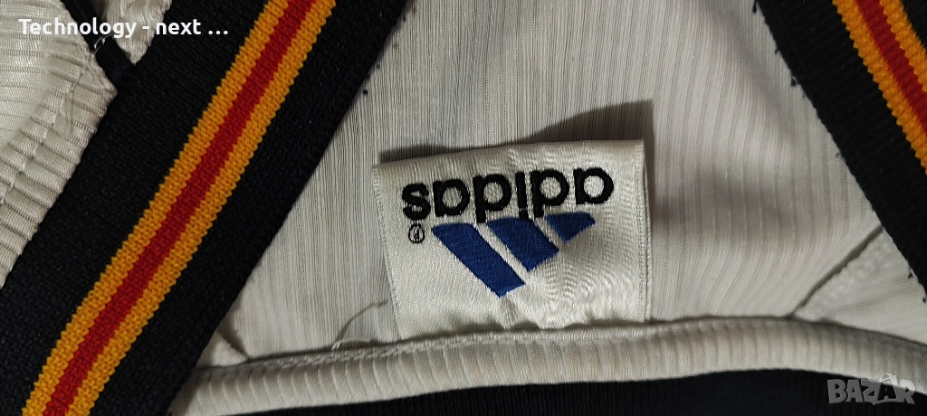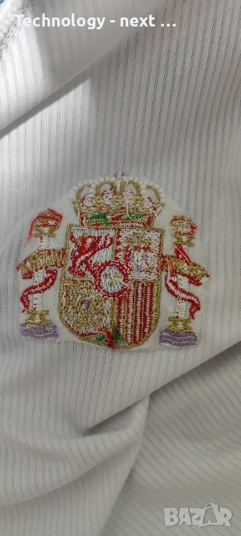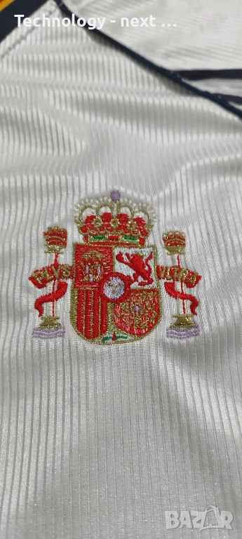 Детайли: Характерният за епохата „жакардов“ плат с втъкани елементи, бродирано лого на Adidas и герб на Испания. Емблематичното лого на RFEF на яката.