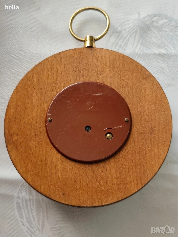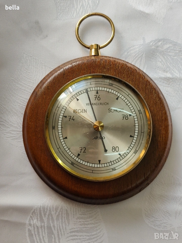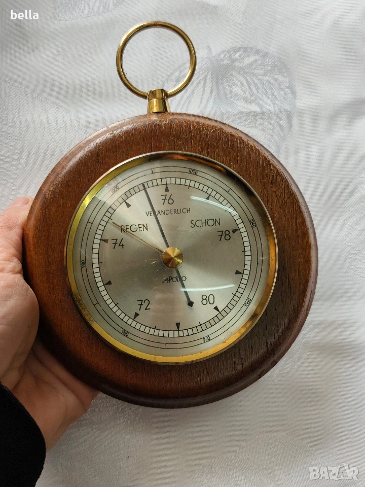 Ретро дървен барометър Regen Veranderlich Schon -Apollo за измерване на атмосферно налягане.Отличен вид 13 см диаметър ,цена 35 евро