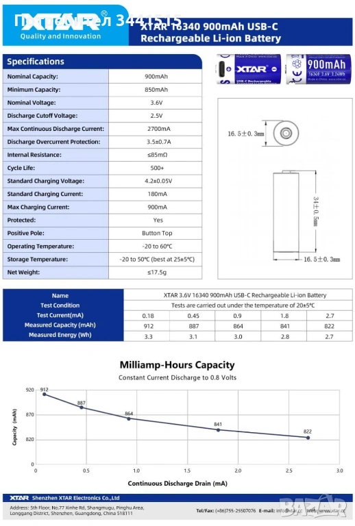 • Капацитет: 900 mAh (мин. 850 mAh)