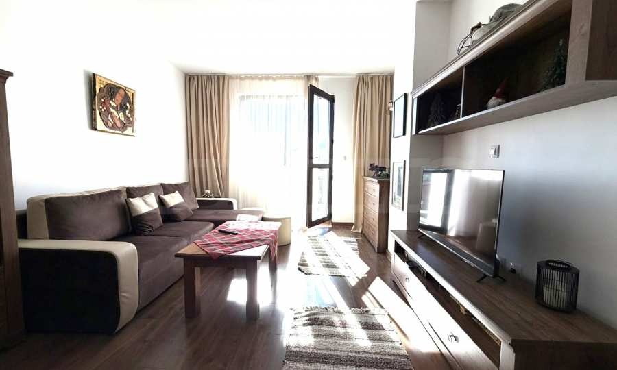 Просторен хол с южно изложение, холна маса, диван, телевизор, балкон с красива гледка към планината и маса за хранене;