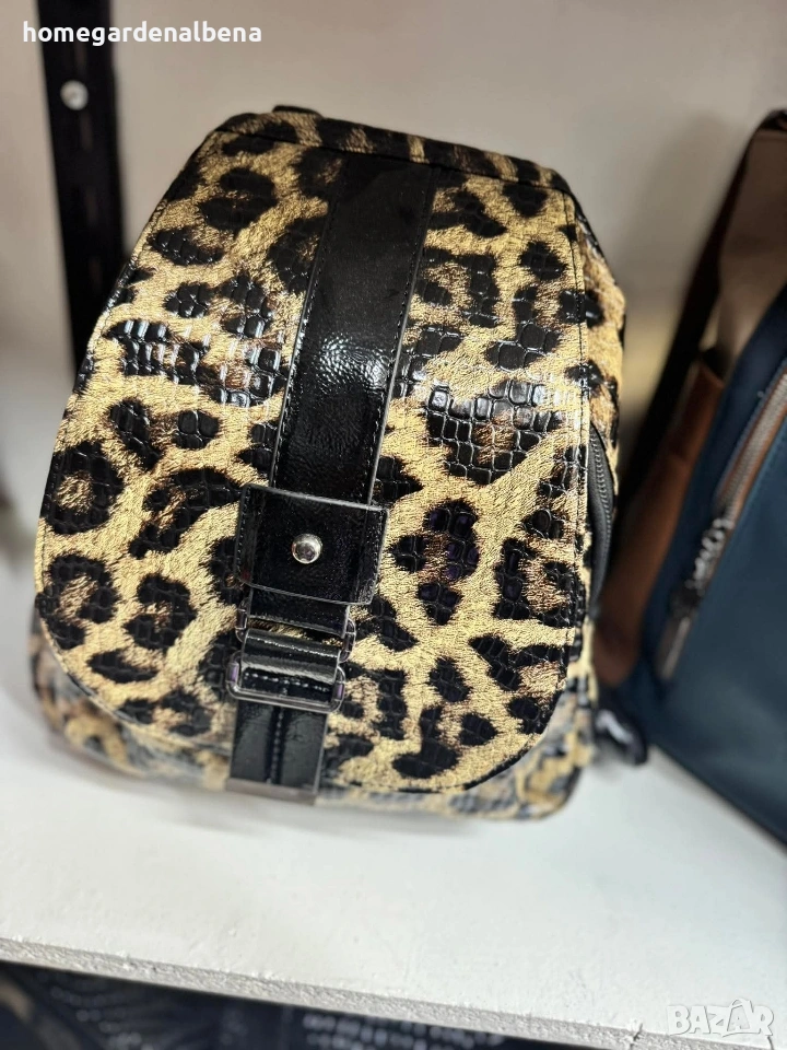 Раницата съчетава животинска принт визия с елегантни детайли — идеална за дами с изразен стил.