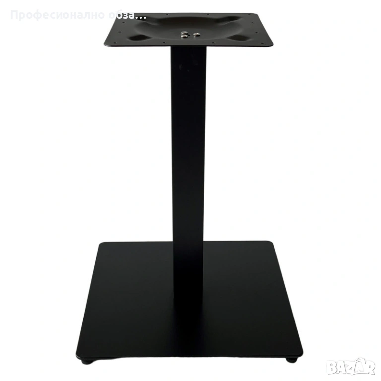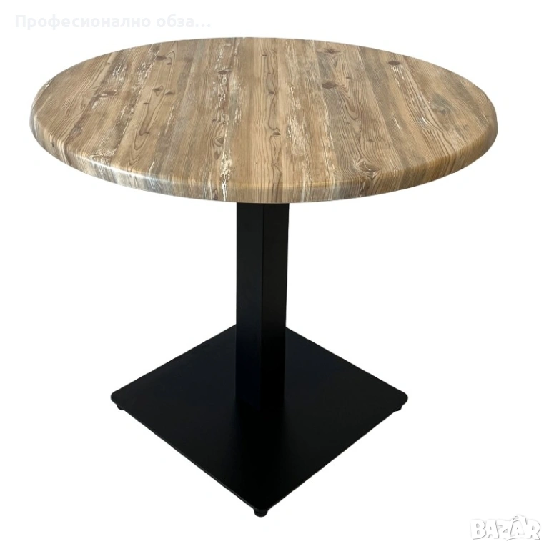 Основата е с размер 50/50 см. с включени крачета за нивелиране. Плота на масата е верзалит с размер ф90см. Височина на масата -75h. Верзалитовите плотове се изработват по специална технология и термична обработка на дървени частици, смоли и меламин. Това е уникален продукт, които издържа на различни атмосферни условия- влага, слънце, температура до 180 градуса и повърхностно износване.