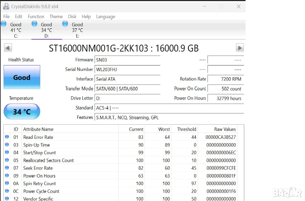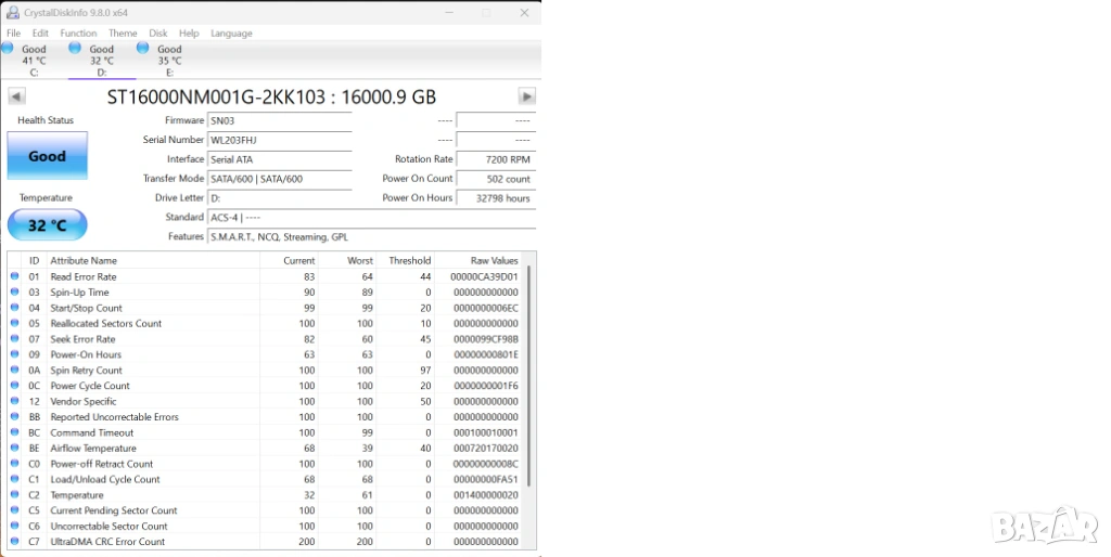 - Power-On Hours: 32,798 часа (работил е стабилно в контролирана среда).