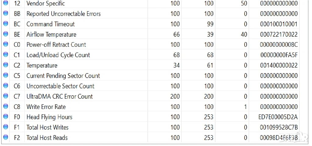 Стойностите в полетата Read Error Rate и Seek Error Rate в отчета са големи числа – това е напълно нормално и специфично за всички дискове на марката Seagate. Те кодират тези данни по различен начин от Western Digital. Това НЕ СА реални грешки, а стандартен отчетен формат за Seagate.