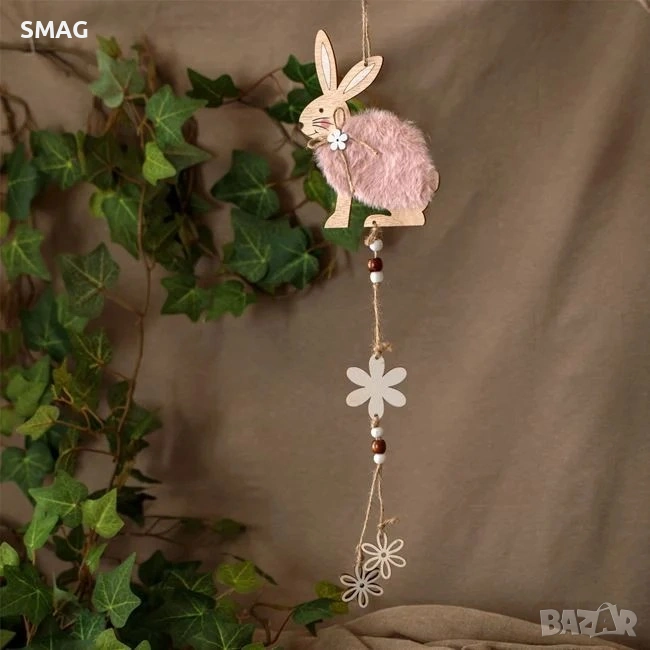 Великденска висяща дървена декорация – зайче с розова синтетична козина и цветя, 12x55 см_1233630