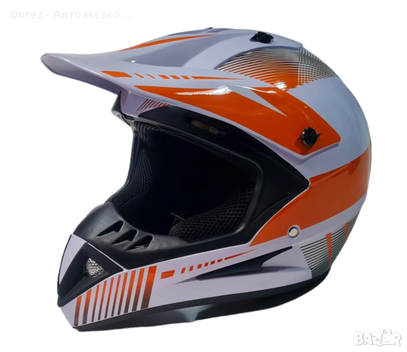 Крос каската за мотор, мотокрос и АТВ в бяло-оранжево е перфектен избор за любителите на динамичното и екстремно каране. Със своя ярък дизайн и гланцово покритие, тя осигурява отлична видимост и модерен спортен стил.