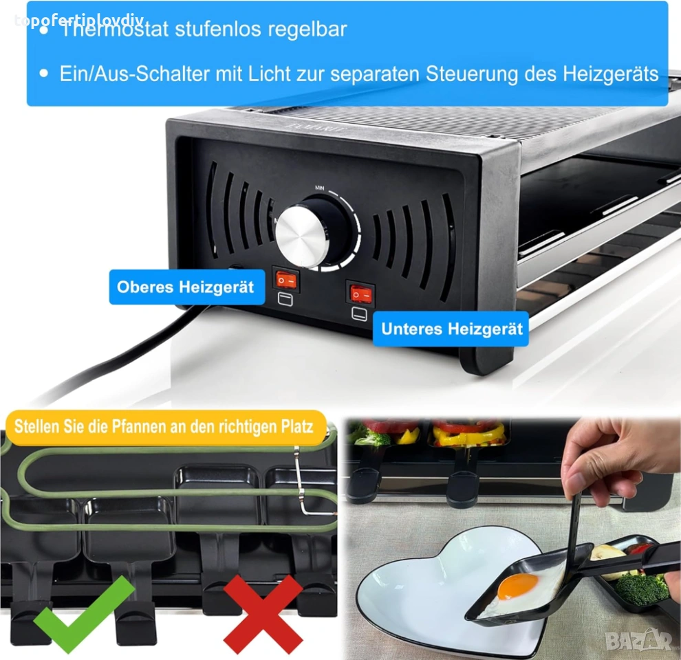 Многофункционални скари за раклет: незалепващите повърхности позволяват приготвяне на пържоли, зеленчуци, скариди, мини пици, палачинки, пържени яйца или раклет със сирене - гарантирано естествен вкус!