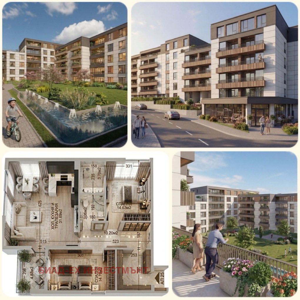 Затворен комплекс състоящ се от четири сгради, вътрешен парк с водни фонтани, който подсигурява на вас време за релакс и отдих, а за вашите деца пространство за игра.