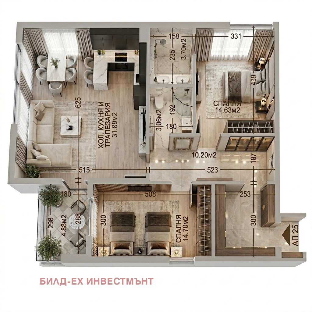 Разпределение на апартамента: Входно антре, просторна дневна с кухненски бокс и трапезария, спалня към която има баня с тоалетна, спалня, баня с тоалетна и тераса
