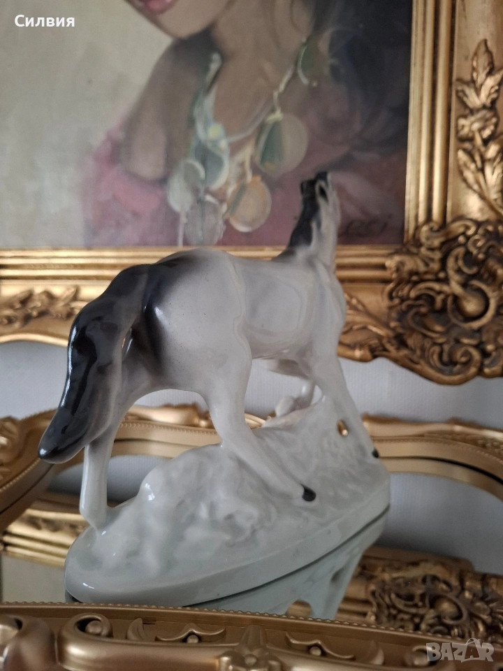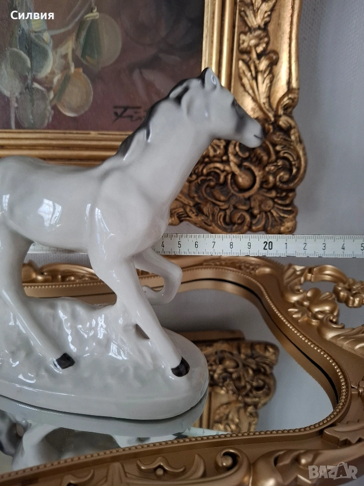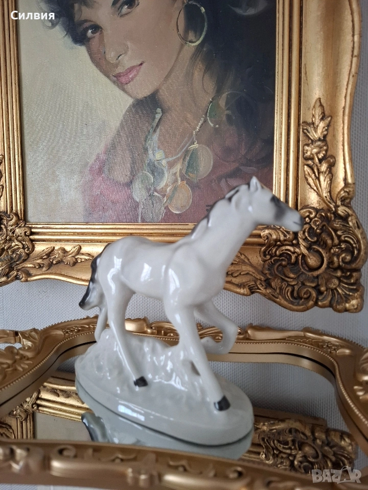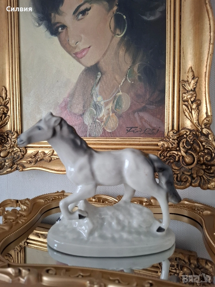 Ретро българска фигура Изида Тази фигурка изобразява препускащ кон, запечатан в динамична и грациозна поза. Изработката е от висококачествен български порцелан, характерен със своята здравина и гладкост. Дизайн: Кончето е решено в меки, преливащи се нюанси на сиво и бяло, които подчертават мускулатурата и движението на животното. Черните акценти върху гривата, опашката и копитата придават завършеност и реализъм. Цена 3️⃣0️⃣€ 58,68лв