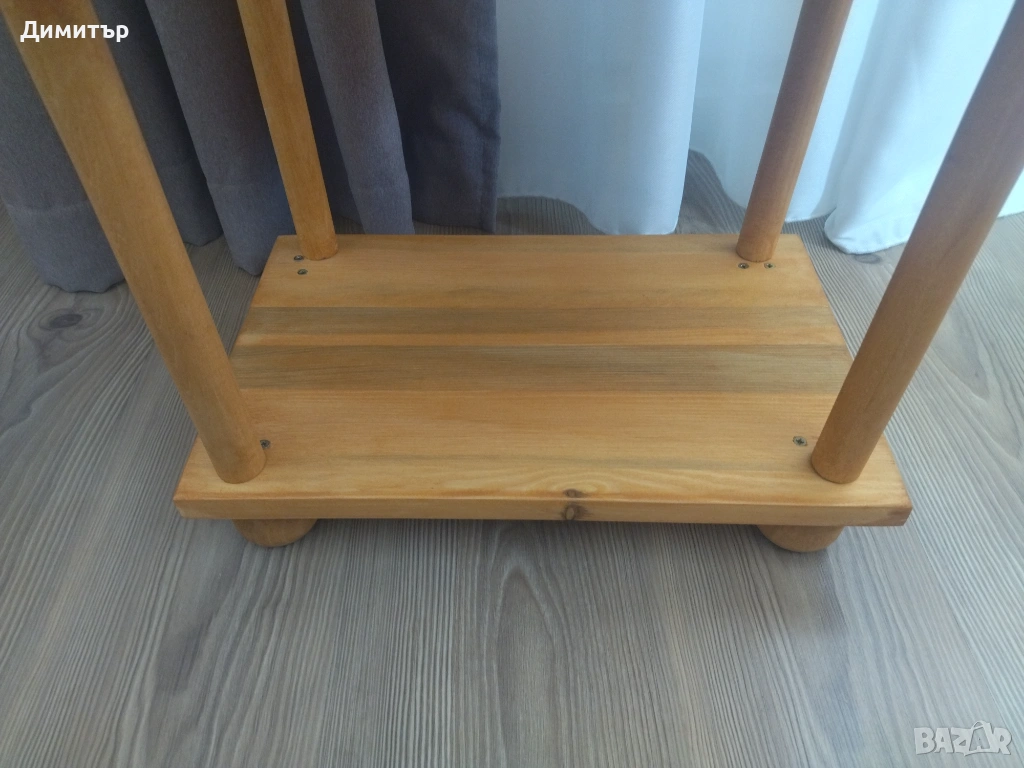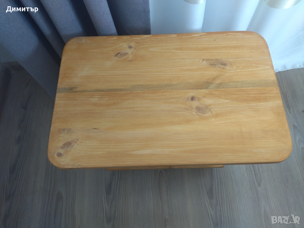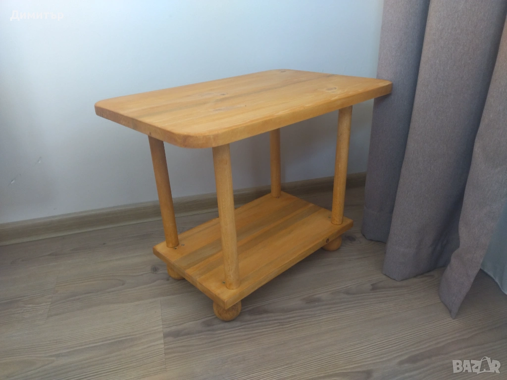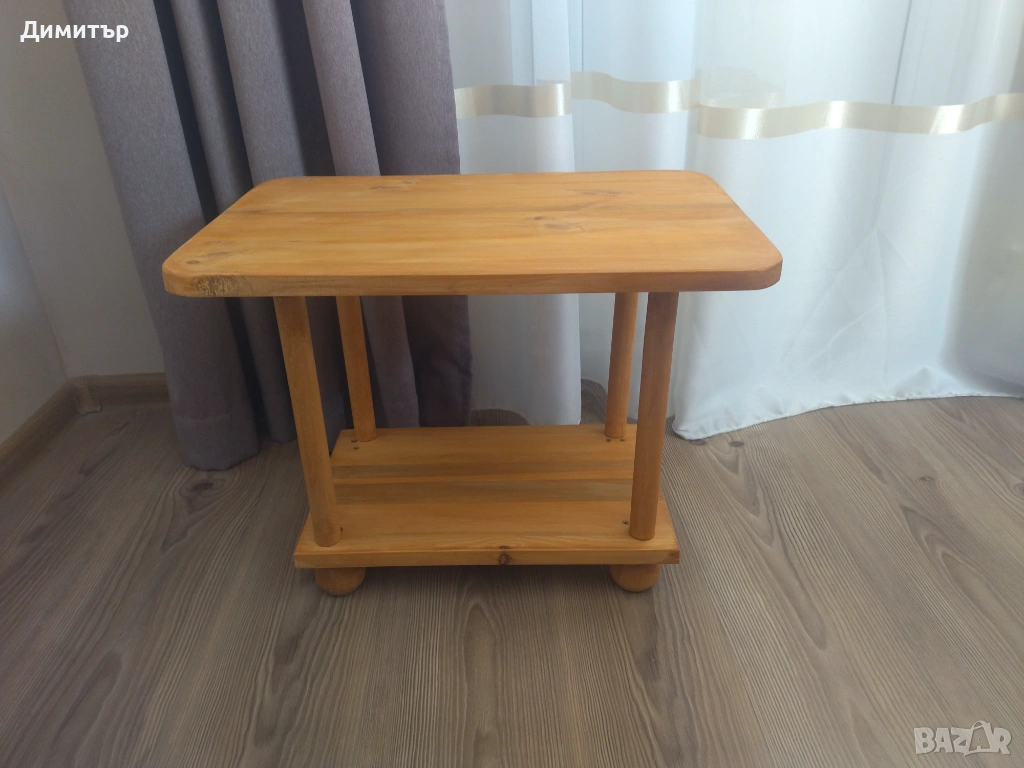 Предлагам чисто нова помощна масичка с размери: Височина 43см. Дължина 55см. Дълбочина 36 см. Големина долен плот 43 х 27 см. Разстояние между плотовете 32см. Масичката е ръчно изработена от иглолистна дървесина, обработена е против дървояди и е състарена за по естетически вид. Цена 23 €.