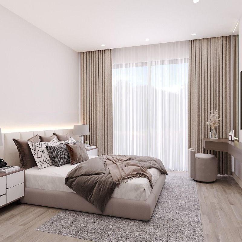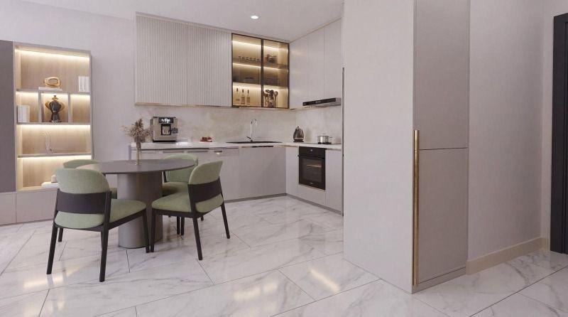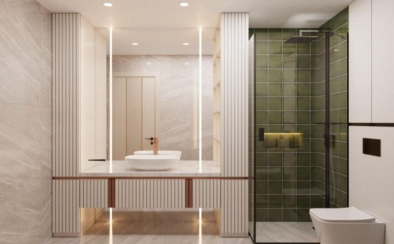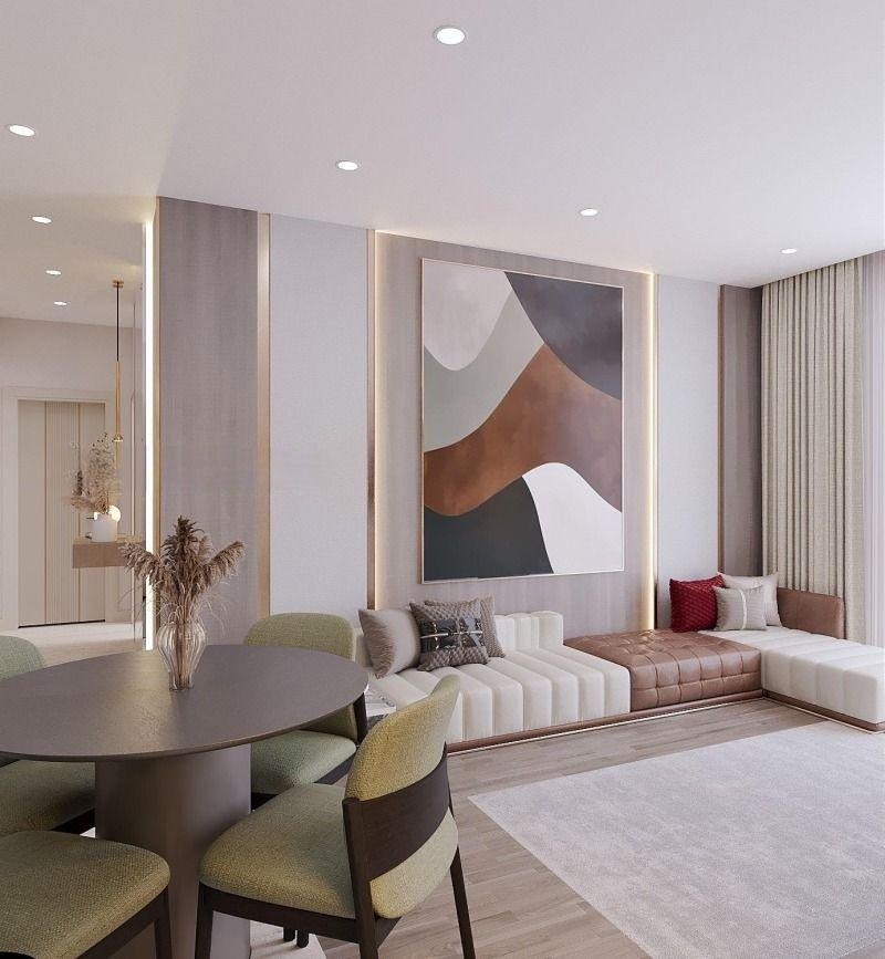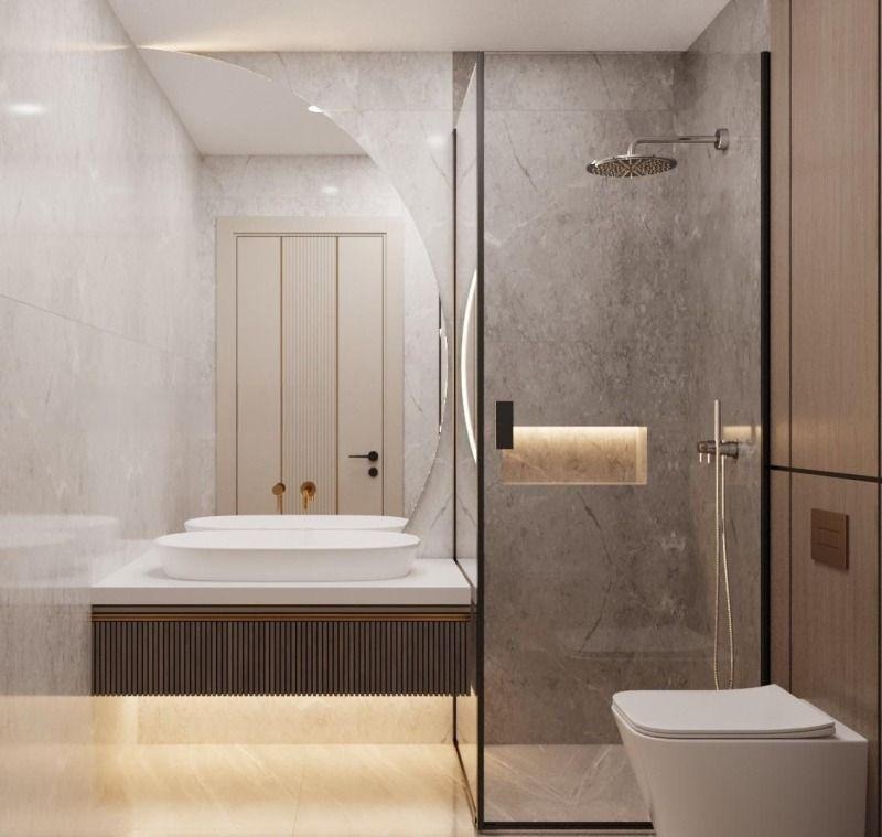 Разпределение: входно антре, кухненски бокс с хол и трапезария, две спални, дрешник, две бани с тоалетна