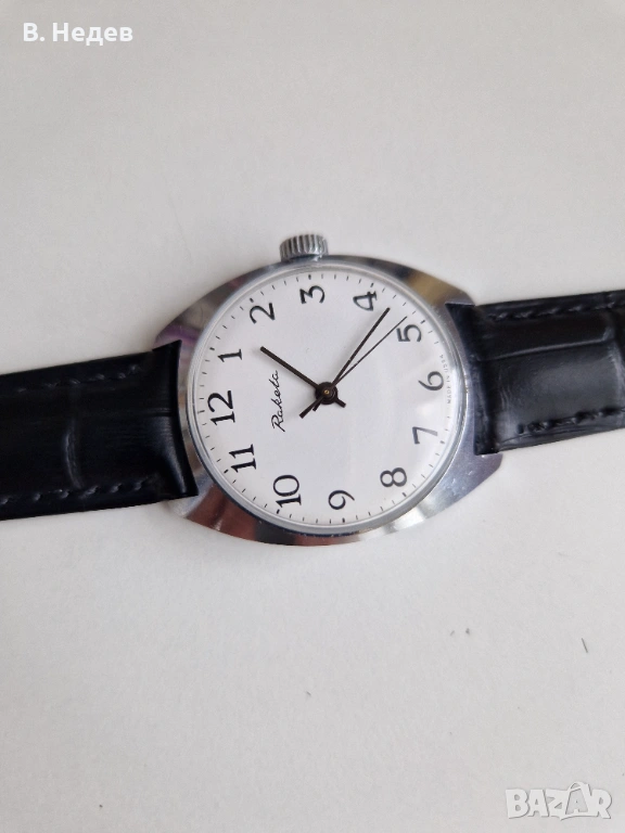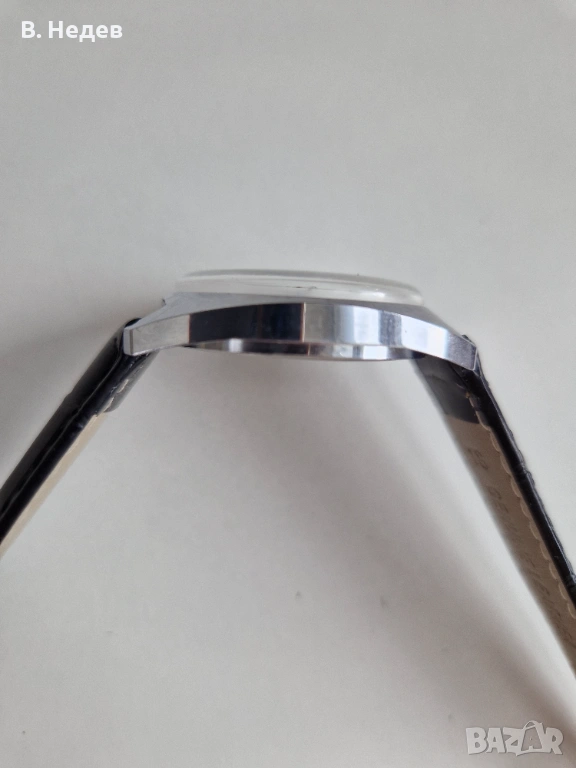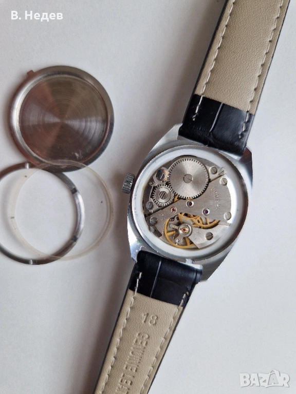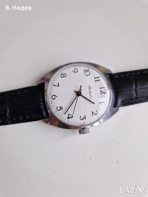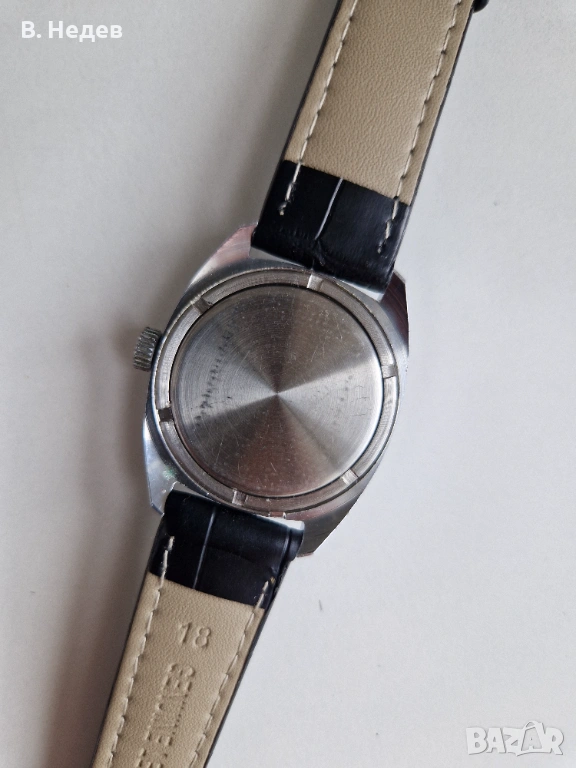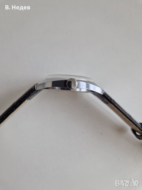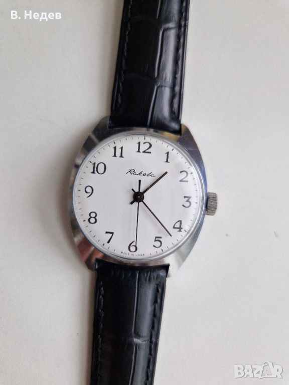 Продаваме този мн. запазен руски часовник. С ръчно навиване, отлично състояние; циферблат, индекси, стрелки, машина - идеални; моля разгледайте подробно снимките! Часовника е с качествена машина - калибър "Ракета"2609.HA, /базовата/ с 19 рубинови камъка, противоударен прецизен баланс, централна секундарна стрелка, амортисьори на баланса и анкъра - действително противоударен часовник. Надеждна и безотказна машина, един от най-популярните калибри на ПЧЗ - Петродворцовия часови завод. Вибрации на баланса - 18000/час. Часовникът е след частична профилактика /сменено е маслото; почистено е изсъхналото и е сложено ново/ и поддържа точно време за механичен часовник – до +30-40sec/ 24 h. Запас на хода - около 44- 45 часа. Надписите върху циферблата: RАКЕТА, made in USSR.