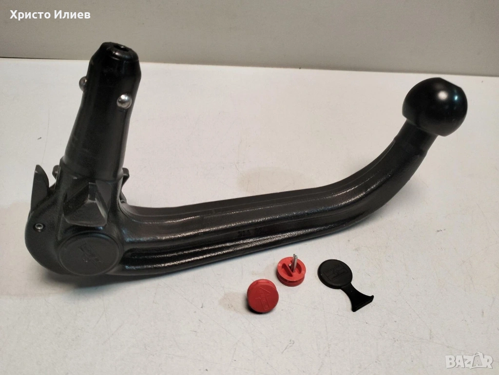 Монтаж: Сферичният държач се поставя отдолу в приемната тръба на теглича и се заключва механично на място.