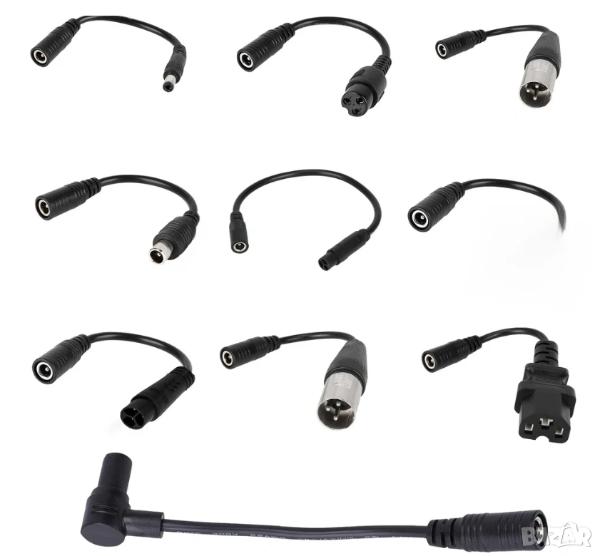 Допълнителни накрайници. Зарядното устройство се предлага с 5.5мм DC конектор, като при Ваше желание, можем да добавим 8мм 3-пин конектор, 12мм 3-пин конектор, 10мм RCA конектор, 8мм RCA конектор, 3-пин мъжки XLR конектор (XLR3) или адаптер конвертор от 5.5мм DC в F-Pin Tou F T-type конектор с дебелина като на компютърните захранвания.