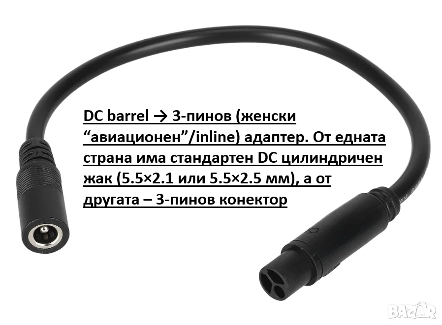 DC barrel → 3-пинов (женски “авиационен”/inline) адаптер: От едната страна има стандартен DC цилиндричен жак (5.5×2.1 или 5.5×2.5 мм), а от другата – 3-пинов конектор:
