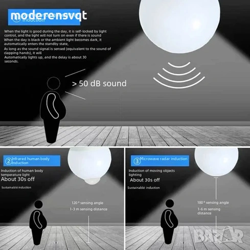 Условие на работа: инфрачервен сензор за движение с помощта на вграден светлинен сензор, свързаното осветление се активира само при праг на яркост под 30 лукса.