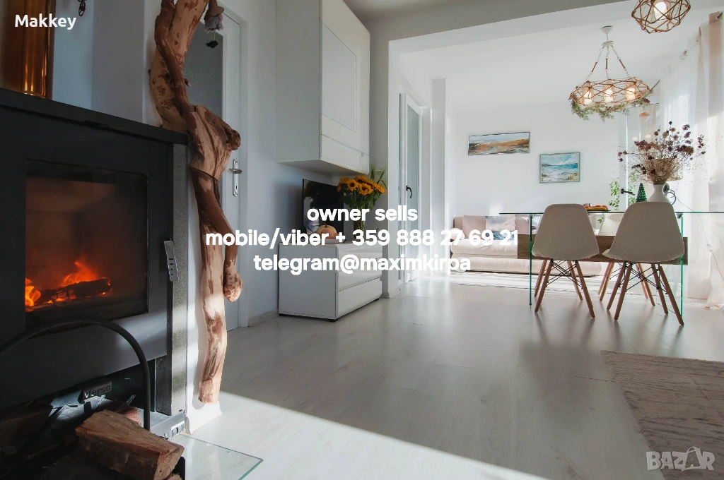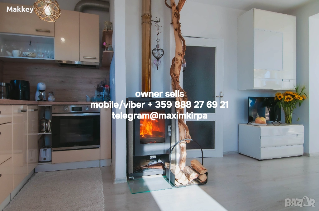 Камина (облицовката с камък запазва топлината), има изход към покрива за обслужване на камината. Мебелите (включително кухнята) са абсолютно нови.