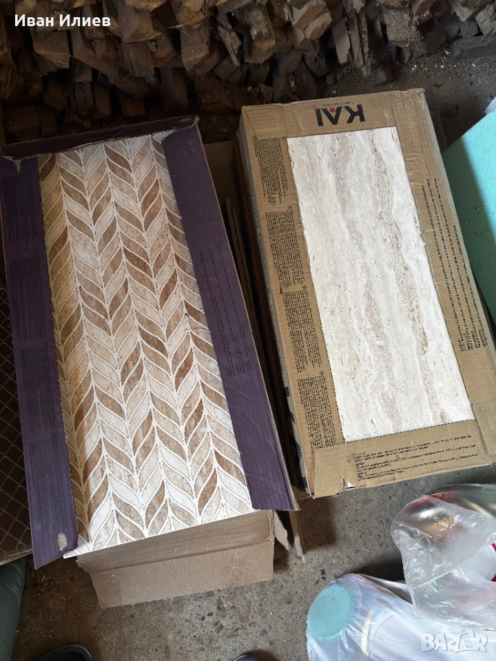Продавам 6м2 плочки. Едните чистите вдясно са две кашончета по 1,62 м2(2х 9 плочки) и вляво снимката са две кашончета без две плочки(9+7 плочки). Цената е обща за всичко. Купувани са за 220 лв. Виждат се на снимките как изглеждат.