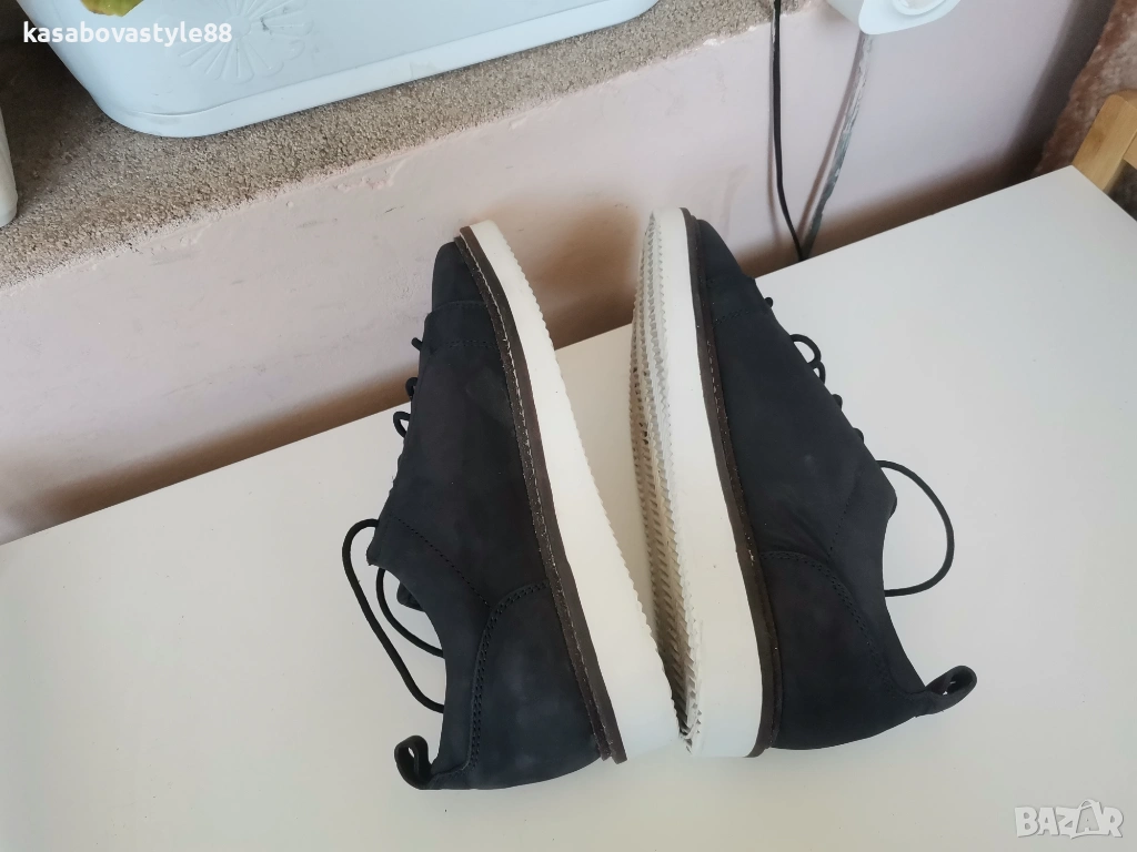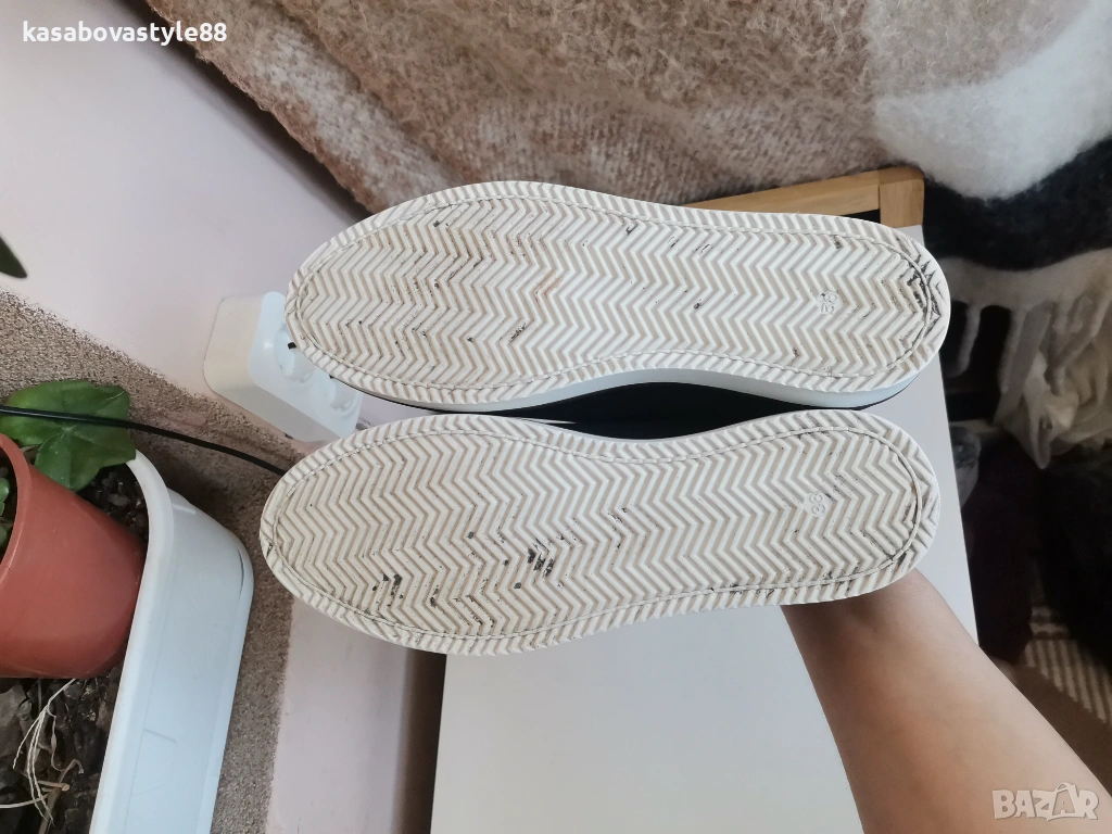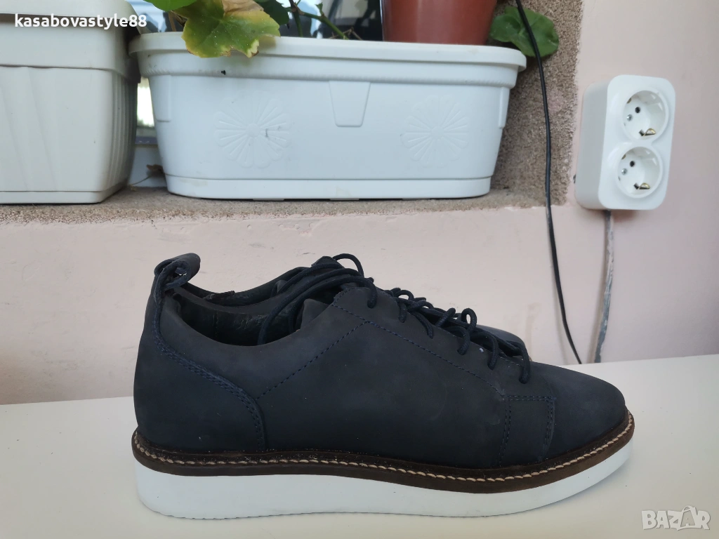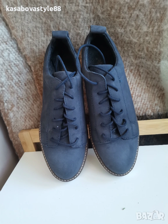 Дамски ежедневни обувки с връзки от естесвена кожа в наситено тъмно-син цвят. Те са на равна бяла подметка с височина отзад см, която в горната част е шита за повече здравина. Вътрешността е изцяло от естествена кожа, както и при стелката. Отговарят на 37.5н.Дължина на стелка 24.5см.