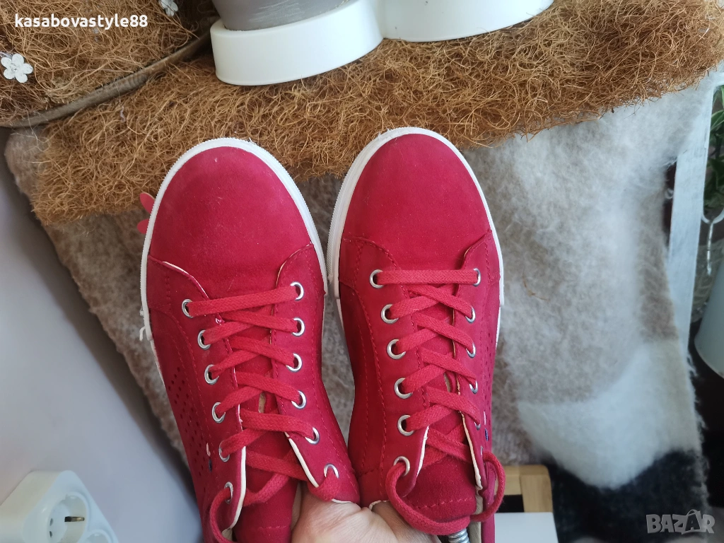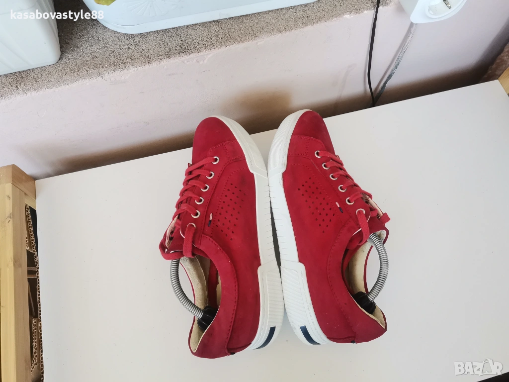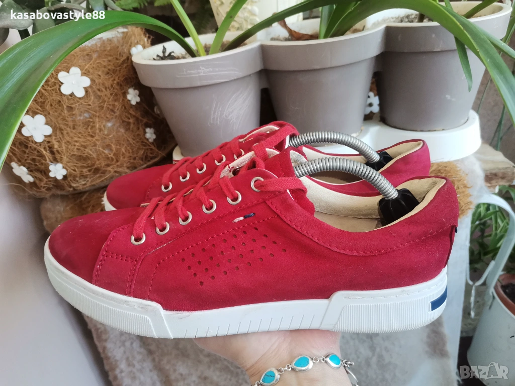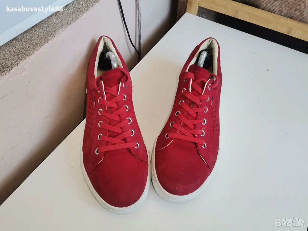 Червени дамски спортни обувки изработени от естествен велур, с лазерна перфорация за по-добра вентилация. Моделът е в изчистен дизайн с връзки и удобна равна подметка. Вътрешността, включително и стелката са от естествена кожа. Ходило-2.5см.Цялостна височина отзад 8.5см.Дължина на стелка 25.5см.