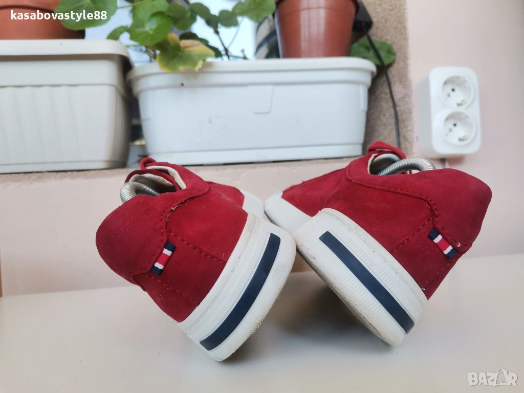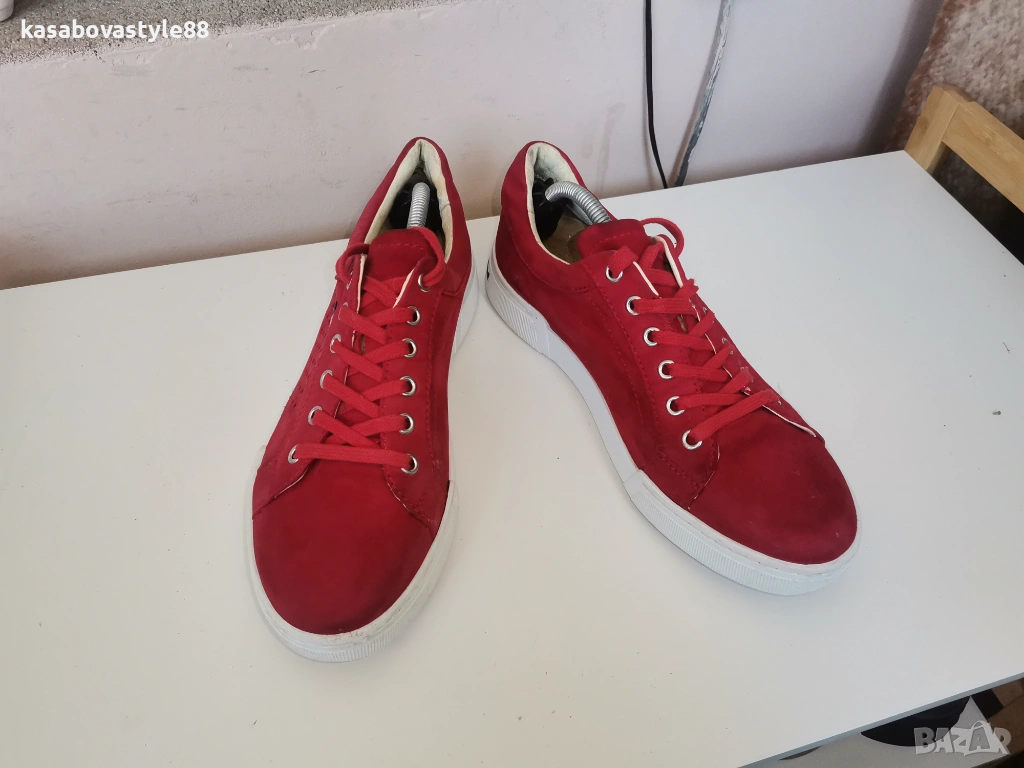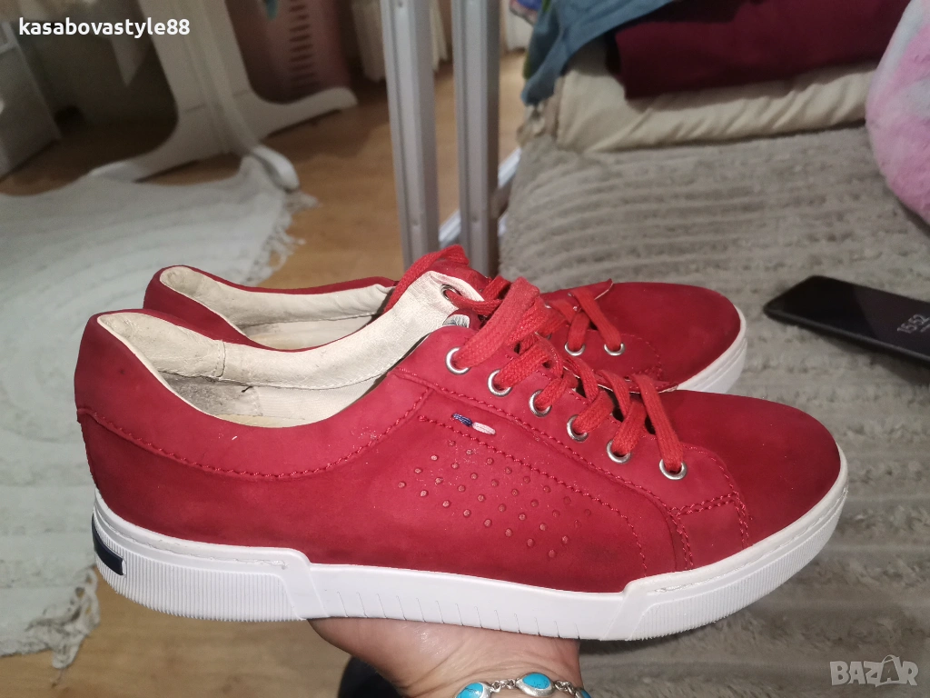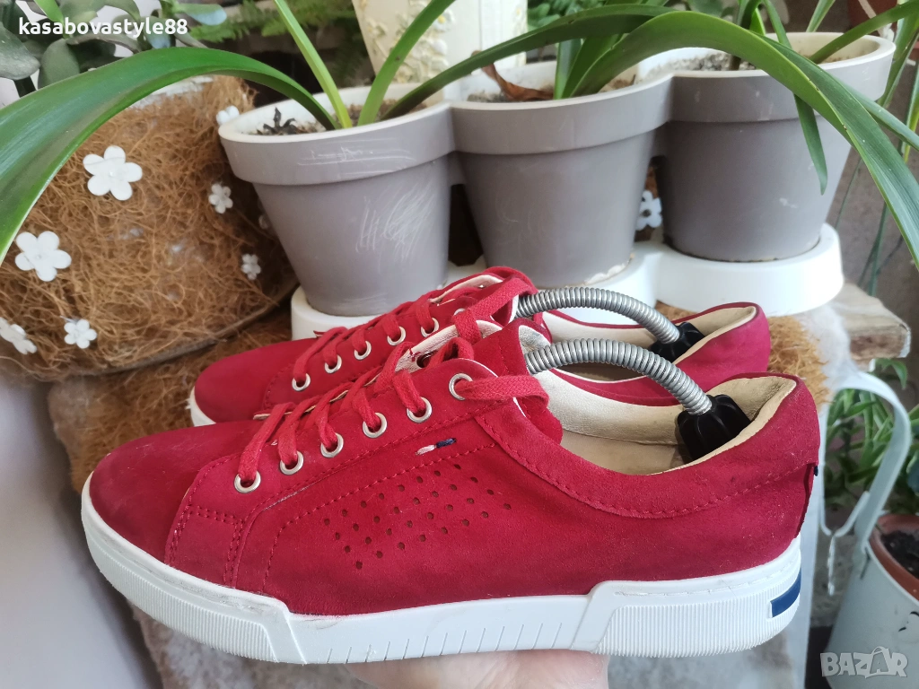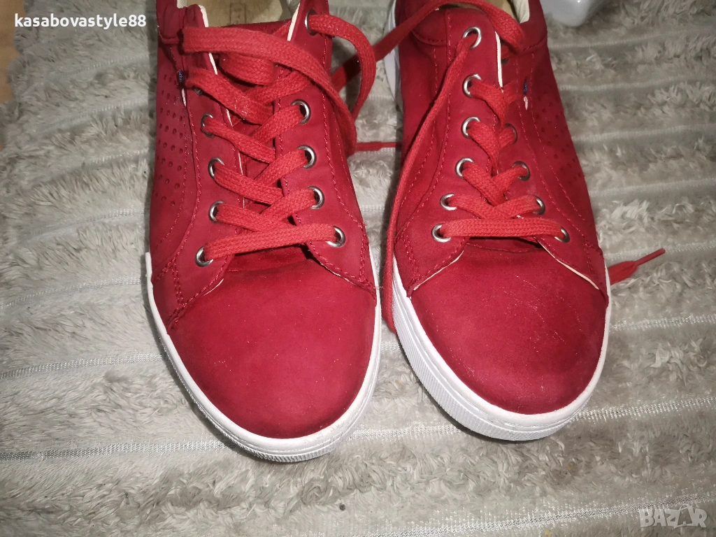 Червени дамски спортни обувки изработени от естествен велур, с лазерна перфорация за по-добра вентилация. Моделът е в изчистен дизайн с връзки и удобна равна подметка. Вътрешността, включително и стелката са от естествена кожа. Ходило-2.5см.Цялостна височина отзад 8.5см.Дължина на стелка 25.5см.
