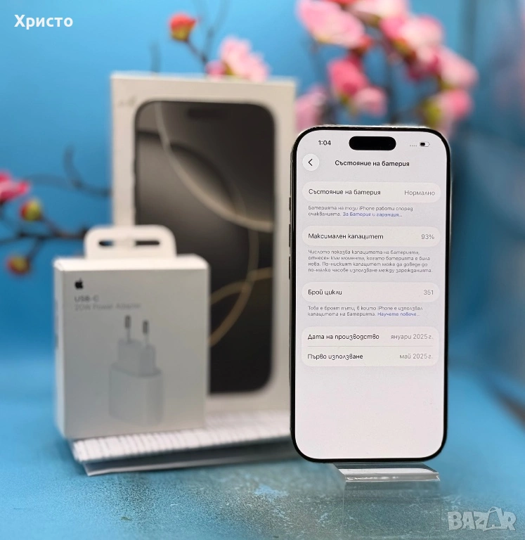 Продава се в комплект с кутия, кабел за зареждане, документи и подарък оригинален адаптер на Apple. Без бартери!!!