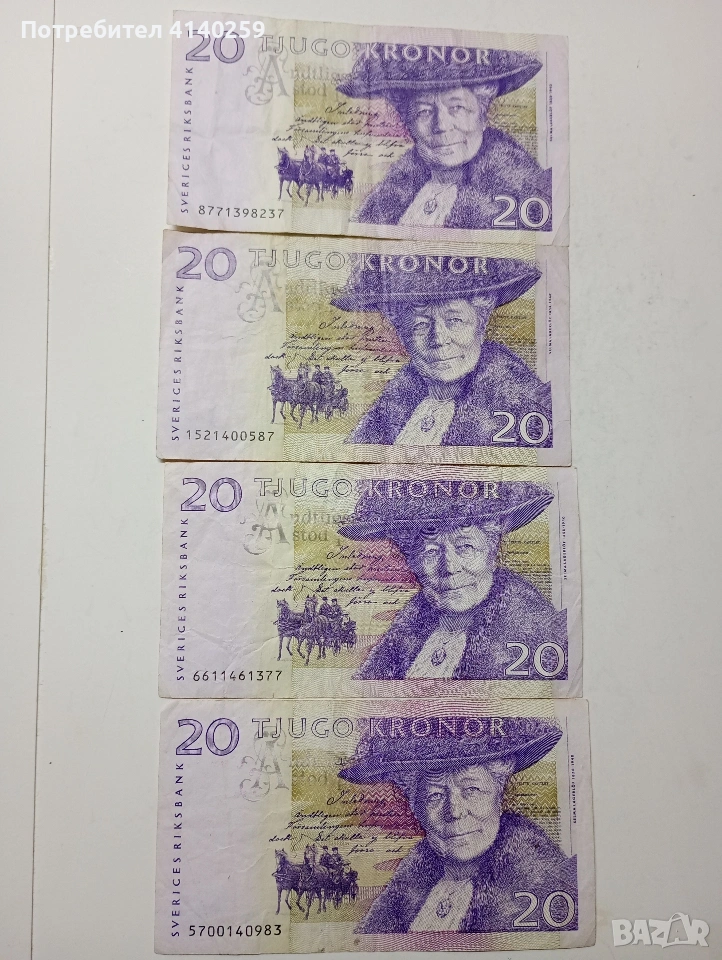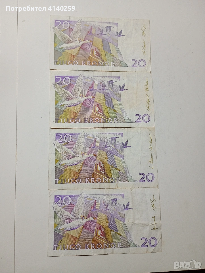 ШВЕЦИЯ БАНКНОТИ 20 КРОНИ 1999 Г СЪСТОЯНИЕ ВИДИМО ПОЛУЧАВАТЕ СНИМАНИТЕ БАНКНОТИ ЦЕНА ЗА 4 БРОЯ РАЗГЛЕДАЙТЕ ДРУГИТЕ МИ ОБЯВИ ДА КОМБИНИРАТЕ ДОСТАВКА ЕКОНТ ЗА ВАРНА ЛИЧНО