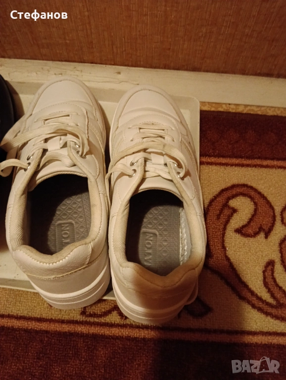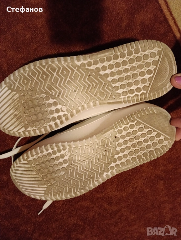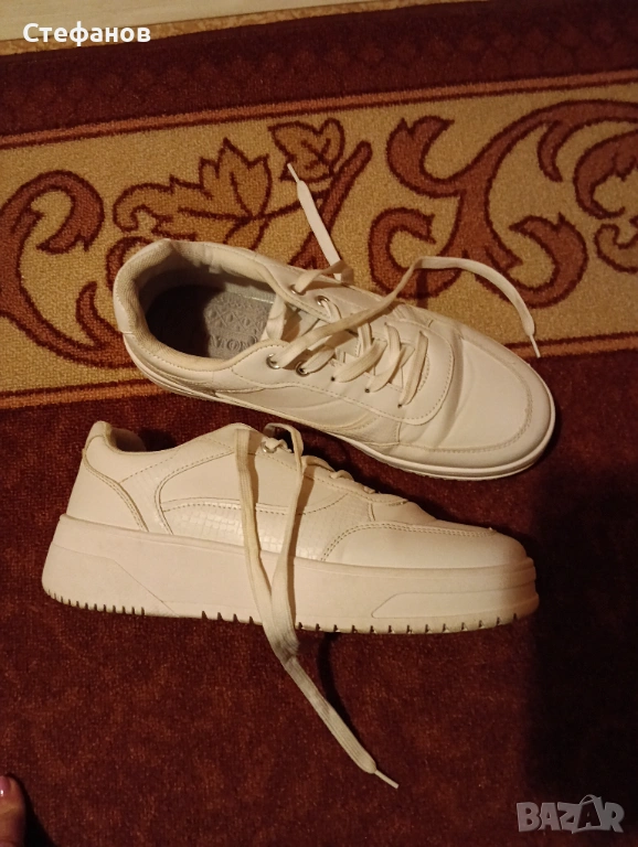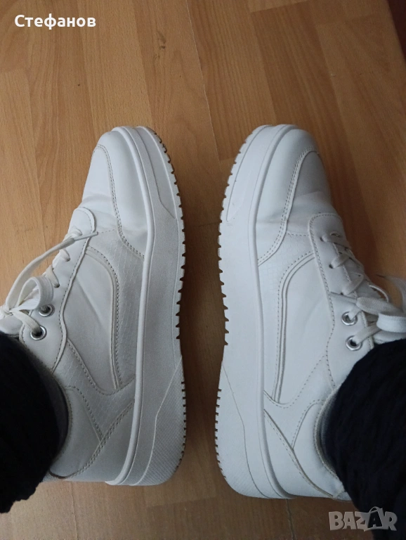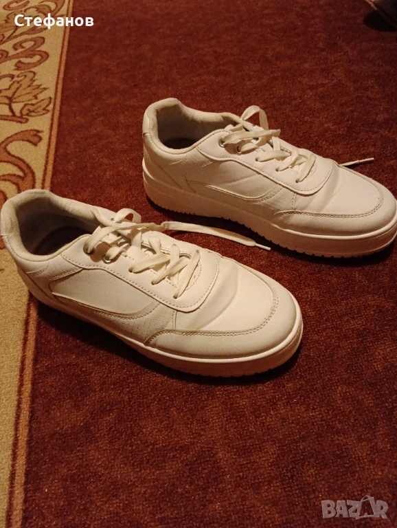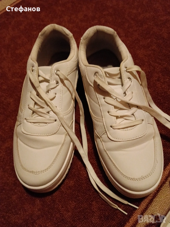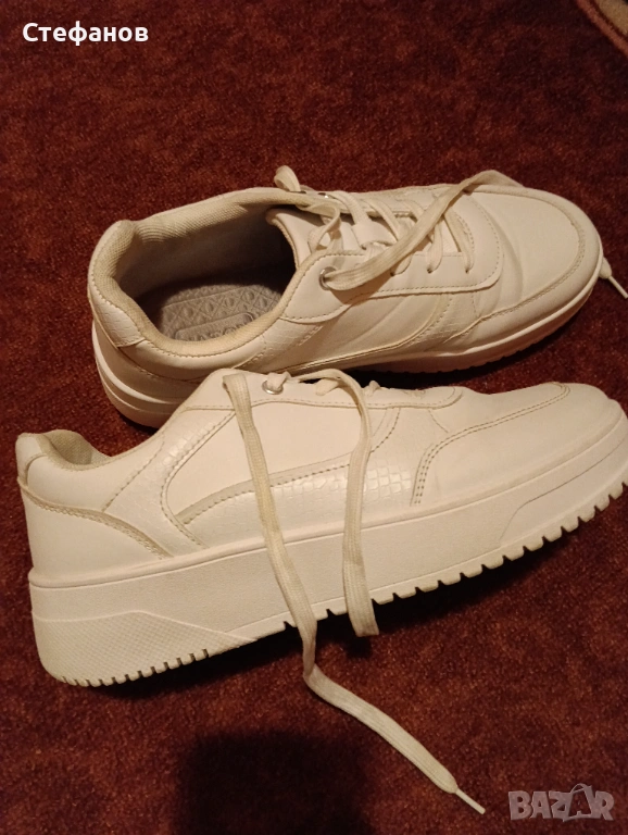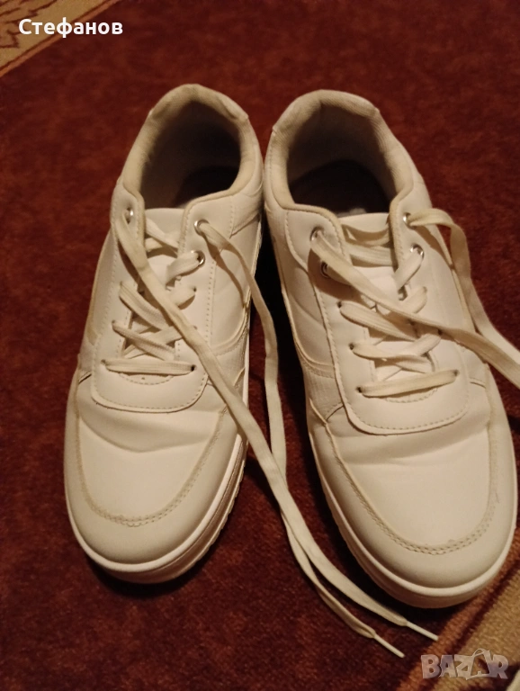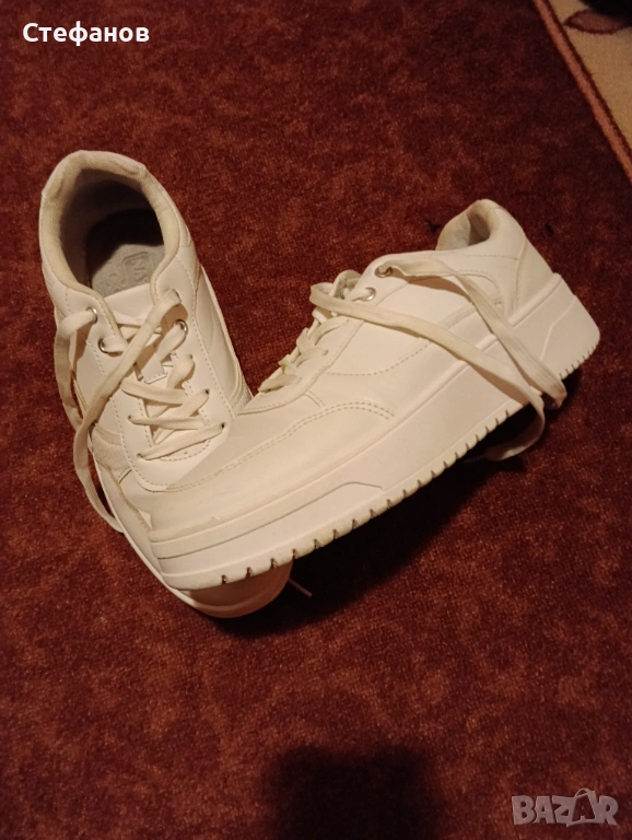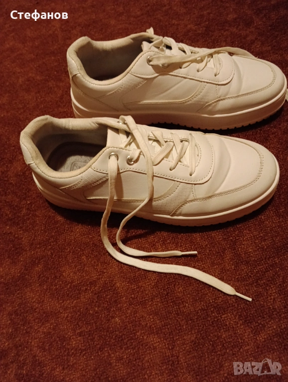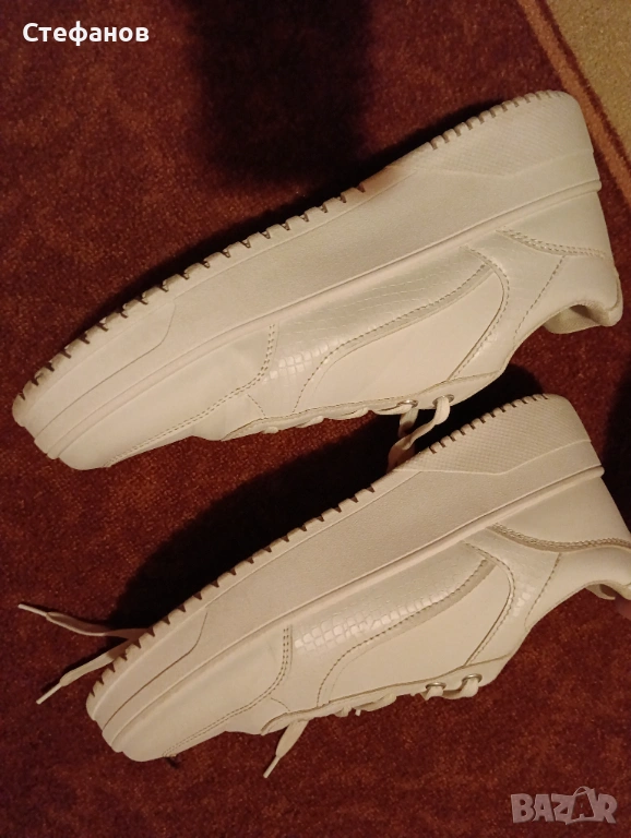 Бели маратонки,хубава ,дебела, бяла ,изкуствена кожа.Стават и за дъждовни дни,с висока подметка,водят се унисекс модел Номера е 41, но са уголемени и са отговарящи на 42. Обути са два пъти,но са много големи и се разчиства гардероб.Вижда се състоянието им от снимките.