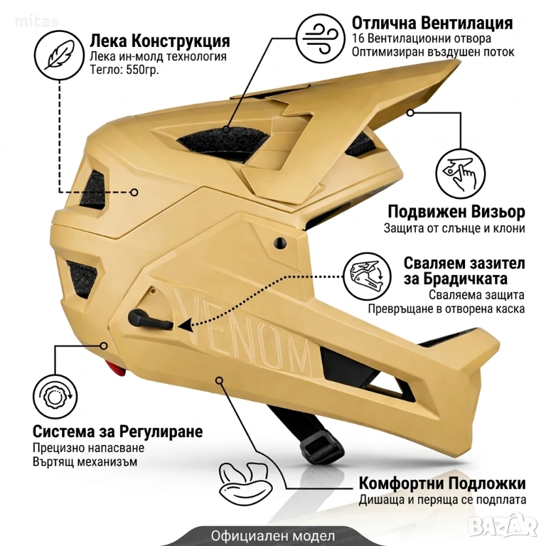 Кросова каска VENOM, Full Face, EN Сертифицирана, Модулна, Регулируема, Размер: S/M