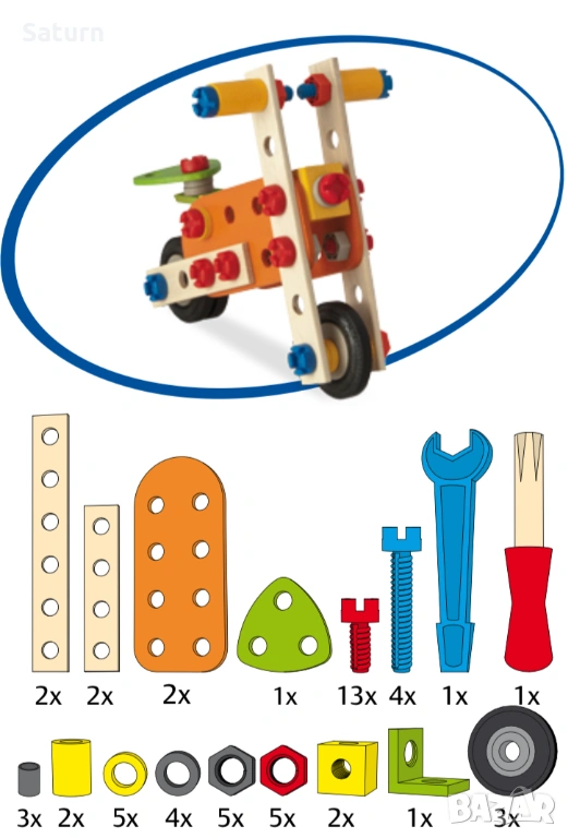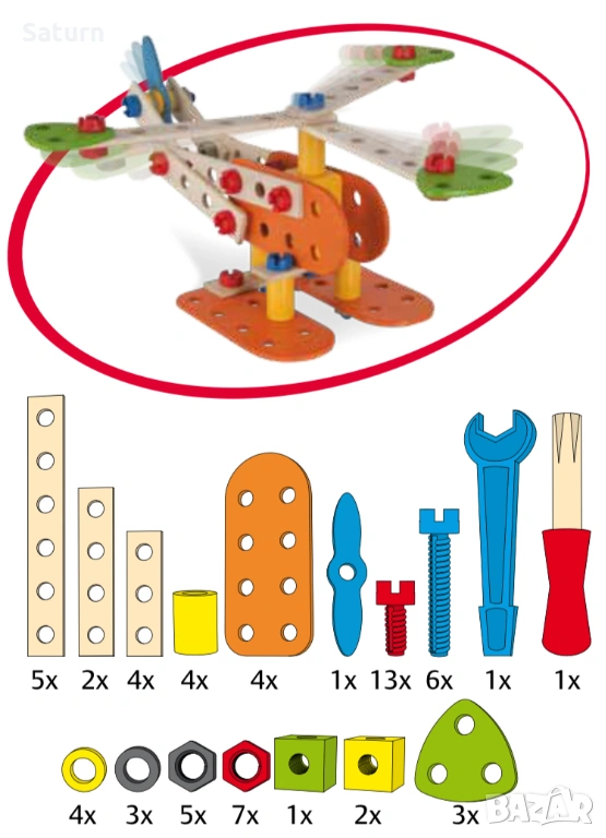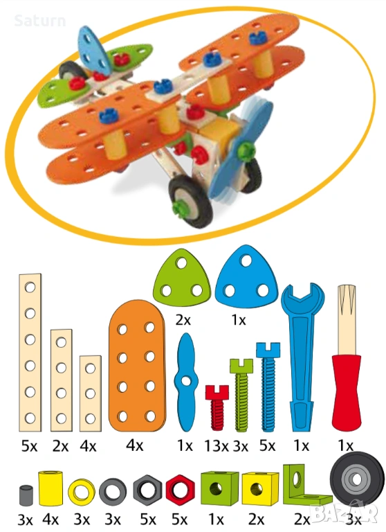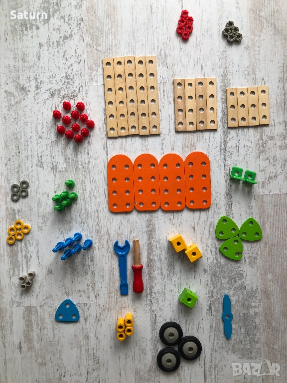 Детски дървен конструктор / дървена играчка на германската марка Heros. Забележките са заснети на втората снимка отблизо. Оригинално бяха 85 части, но има 3, които липсват (1 червен болт, 1 червена гайка, 1 сива гайка). Имам упътването в дигитален формат.