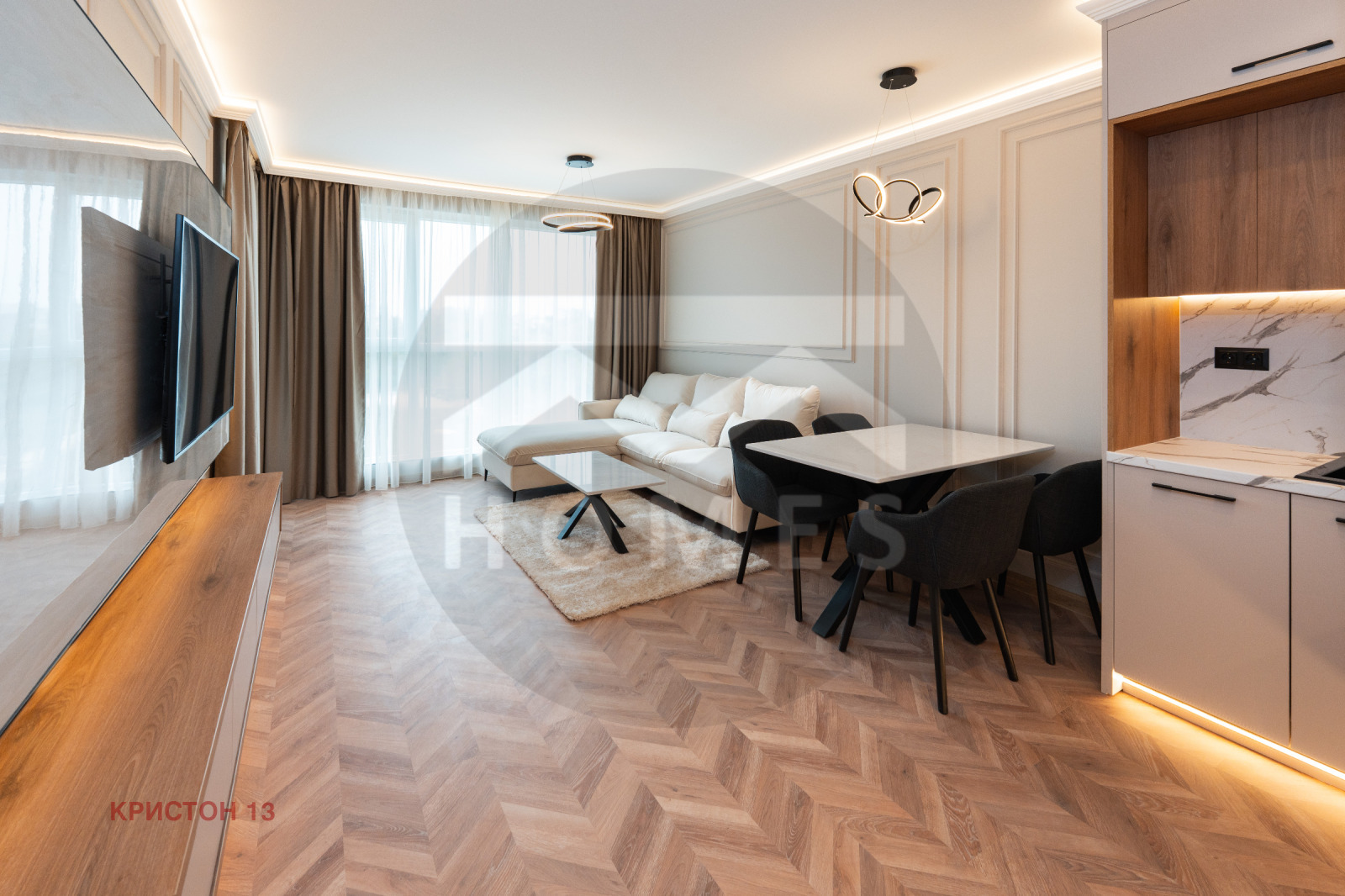 Жилището е с АКТ 16. Имотът е със следното разпределение - антре,баня, дневна с кухненски бокс,спалня и терасa. Напълно оборудван с уреди - керамичен плот, фурна, аспиратор, хладилник, пералня, съдомиялна, 2 бойлера и 2 климатика. Tерасата е с градински мебели.