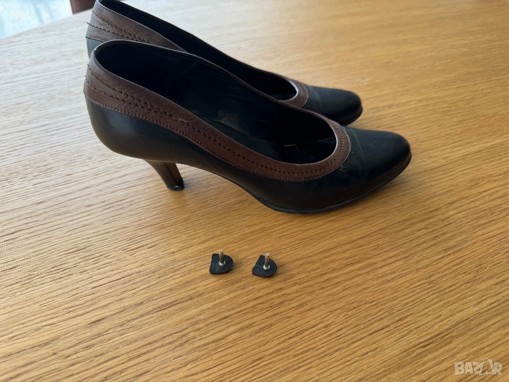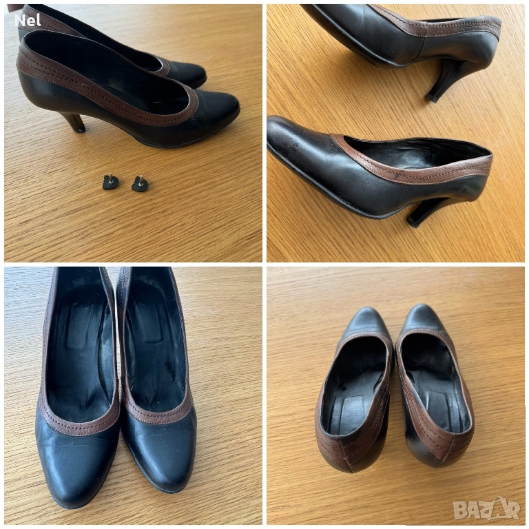 *Черни обувки с кафяв кант от естествена кожа. Размер 40, дължина на стелката 26см. Токче 7см. Има и резервни капачки.
