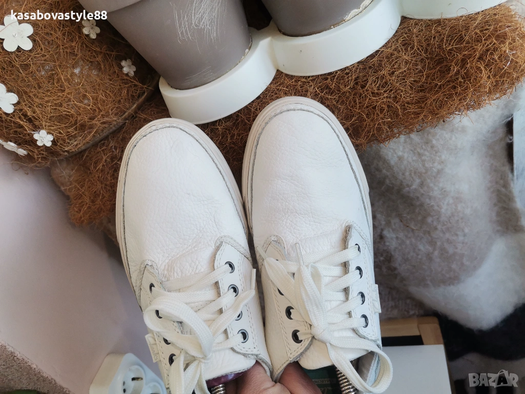 Ежедневни дамски обувки от висококачествена естесвена кожа в бял цвят. Отлично състояние!! Отвътре са с комфортна стелка и дишаща текстилна материя. В горната си част са шити за повече здравина. Височина на ходило 2см.Цялостна височина отзад 7.5см.Дължина на стелка 27.5см.