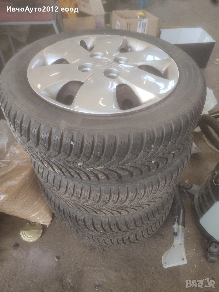 комплект зимни гуми с джанти и тасове за kia picanto rio Hyundai getz i 10 Две гуми са почти нови с 8 мм протектор две са с 4мм . По джантите има ръжда иначе са прави без удари и дефекти. цена за комплекта 100е