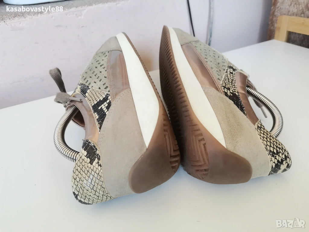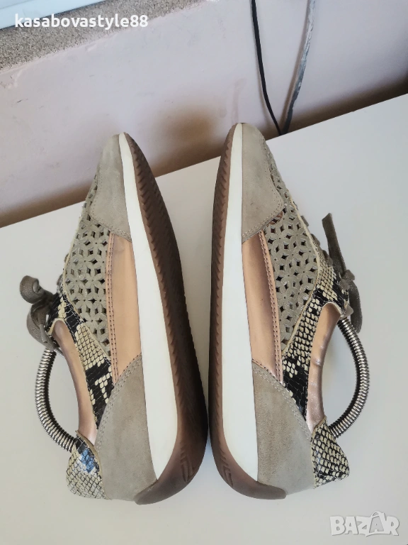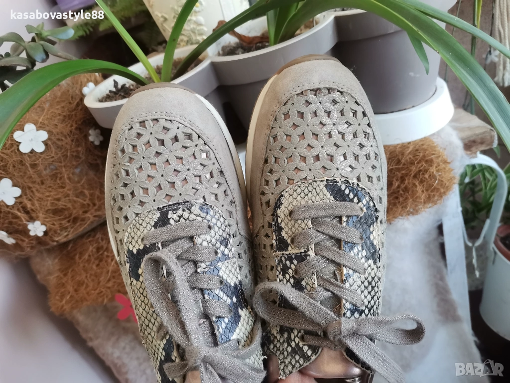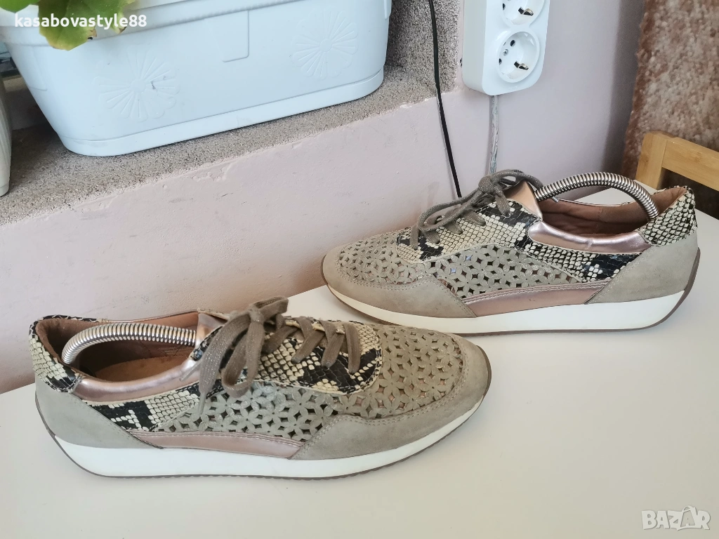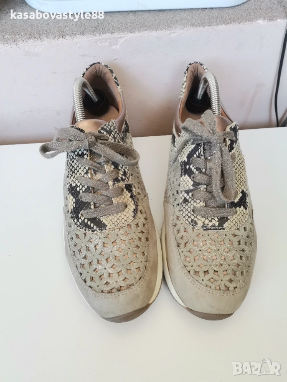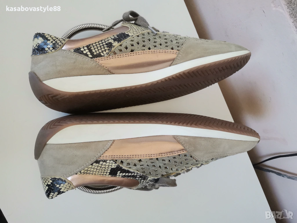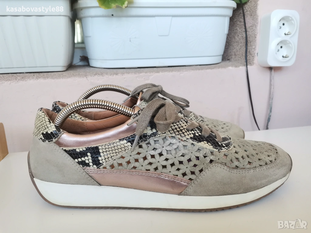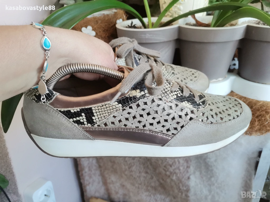 Актуален модел висококачествени спортни обувки на марката Аra Направени от естествен велур с цветя в бежов цвят, които са с открита перфорация за по-топло време.Имат златисти елементи и красива змийска щампа. Изключително гъвкаво и олекотено ходило, което омекотява при движение с височина в страничната част 2см.Дължина на стелка 27.5см.Цялостна височина отзад 8.5см.