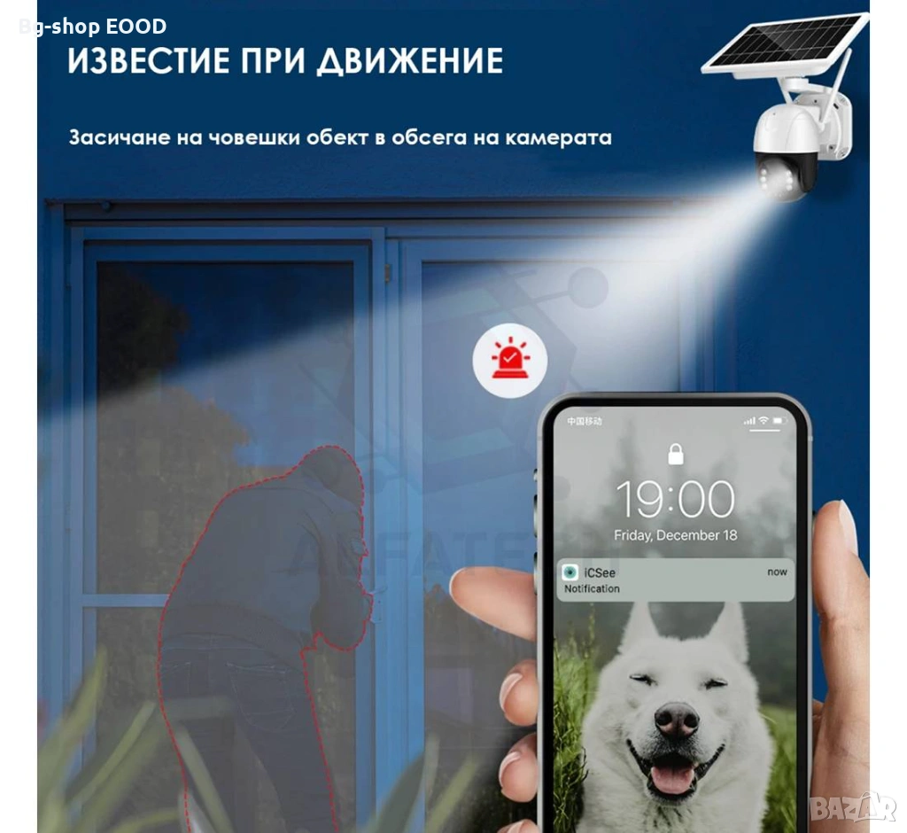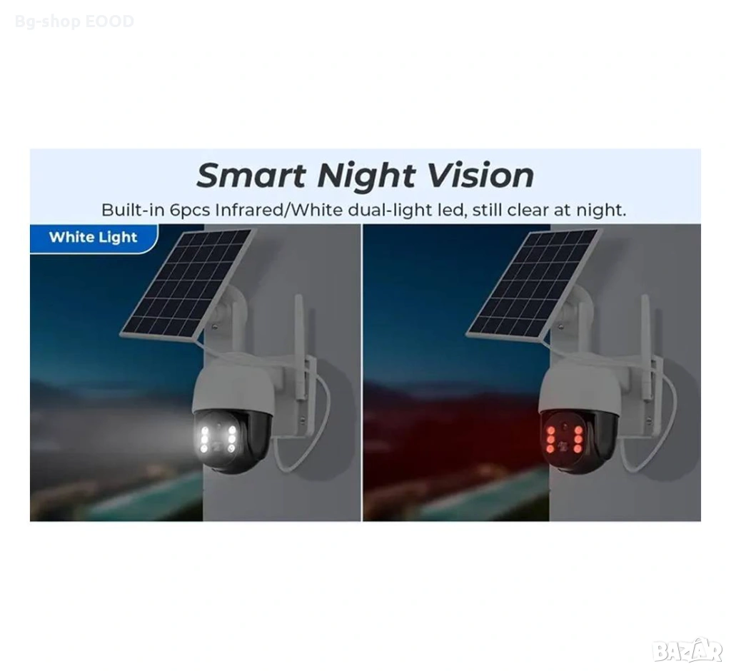 Иновационната камера е напълно безжична, с вграден соларен панел, което спестява допълнителни разходи за окабеляване или допълнителна соларна система. Една цяла система е събрана в едно. Соларният панел събира светлината и зарежда включените мощни батерии. С енергията от напълно заредени батерии камерата може да работи повече от 24 часа. Батериите се зареждат непрекъснато от дневната светлина. Соларна безжична Wi-FI IR камера с автномно захранване. Full HD резолюция, вграден говорител и слот за SD карта с памет до 128GB.