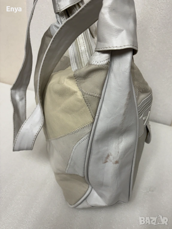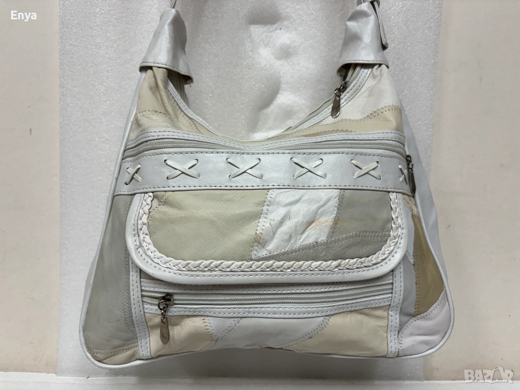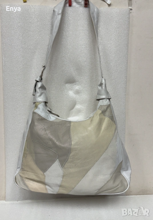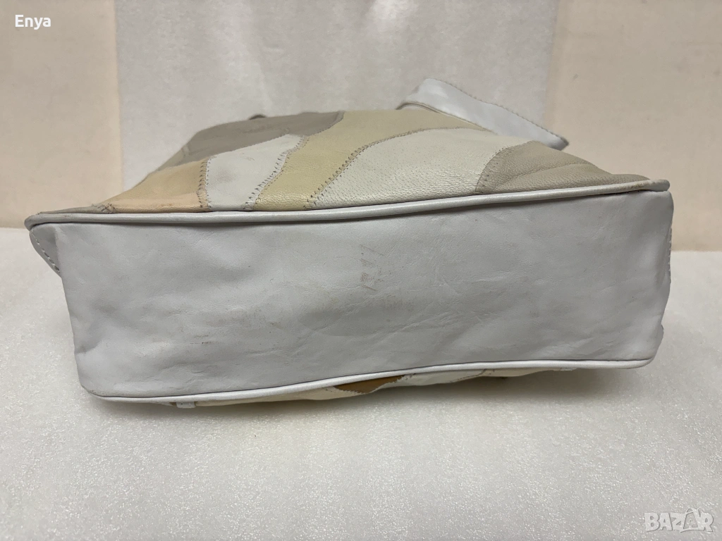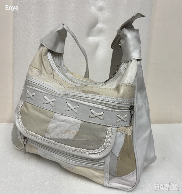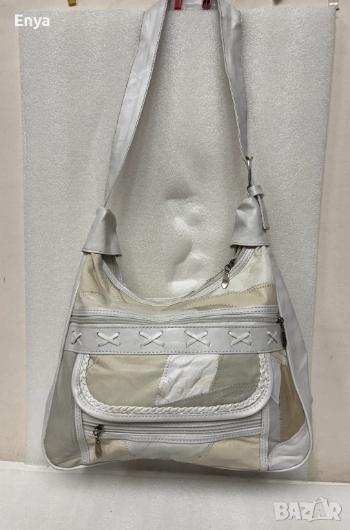 Дамска чанта за през рамо направена от малки парчета много мека кожа, която прилича на естествена в бели и бежови цветове.