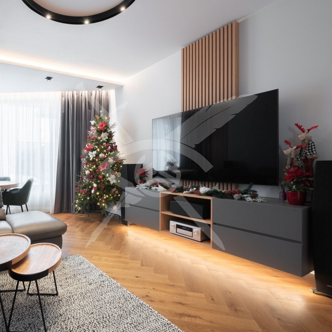 РАЗПРЕДЕЛЕНИЕ: Жилището разполага с площ от 133 кв.м., разпределена във просторно входно антре, голяма дневна с кухня, три спални, едната от които със собствен дрешник и две бани с тоалетни.