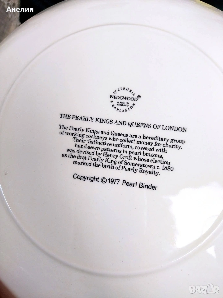 Текстът на гърба на чинията описва "Перлените крале и кралици на Лондон" (The Pearly Kings and Queens of London), които са наследствена група от работническия клас на Лондон, събиращи пари за благотворителност.