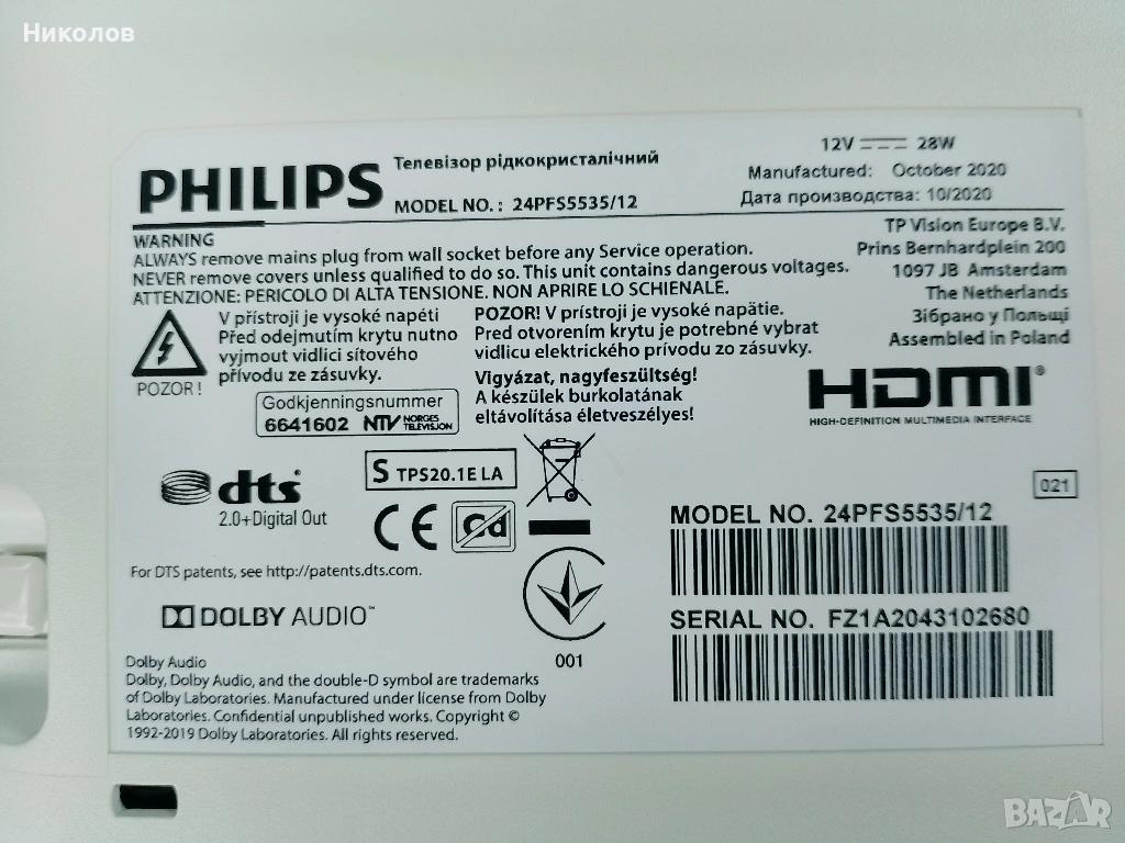 TV PHILIPS LED 12V 24PFS5535/12 "Poland" "10 месец 2020г." Проблем в подсветка! ! ! Дистанционно оригинално със кабел като нови! "к-т 35€" По Еконт със -10% за доставка! За София "Възможна" доставка до адрес!