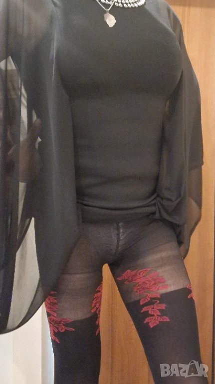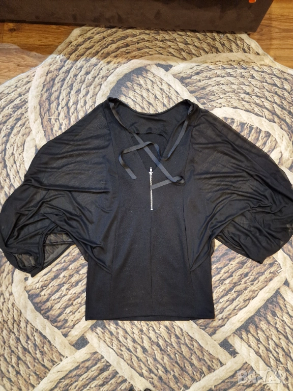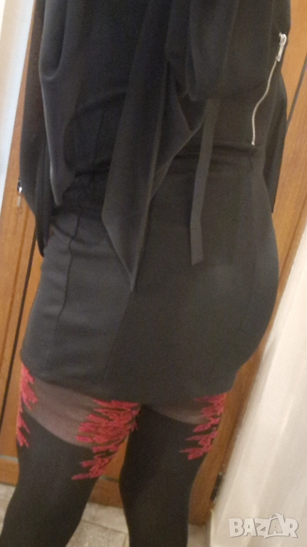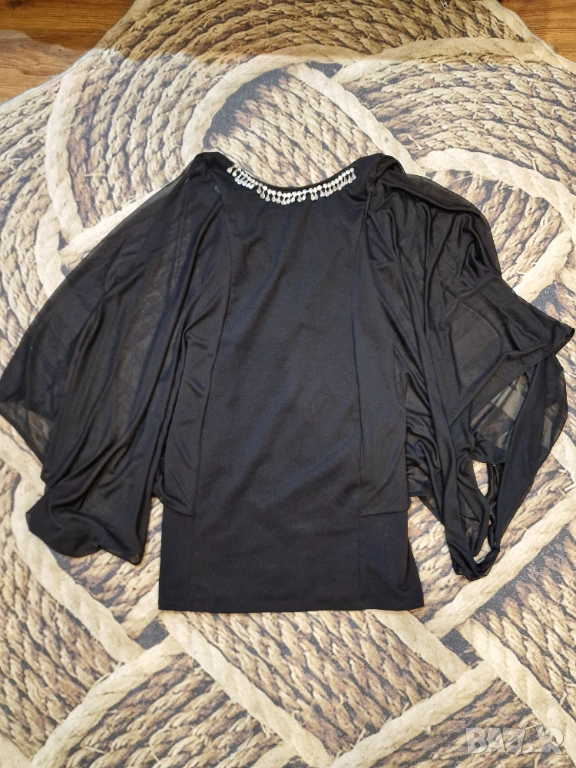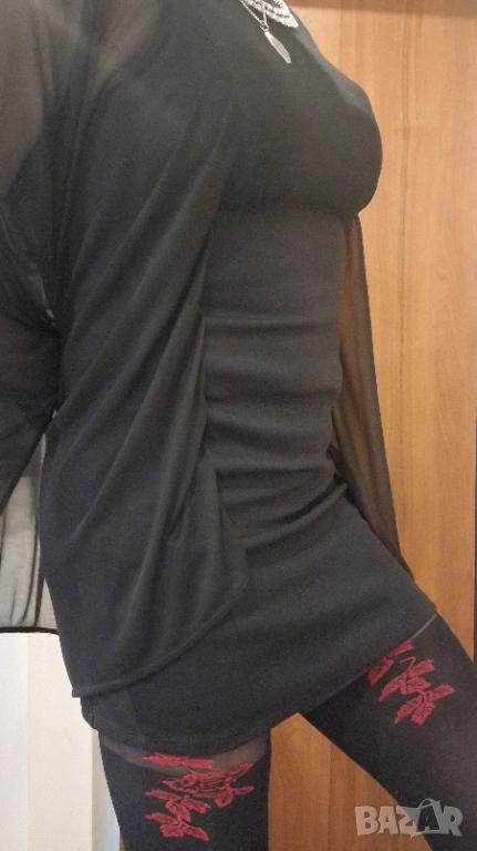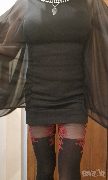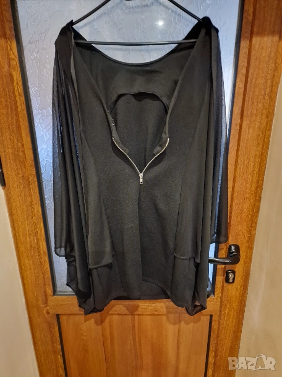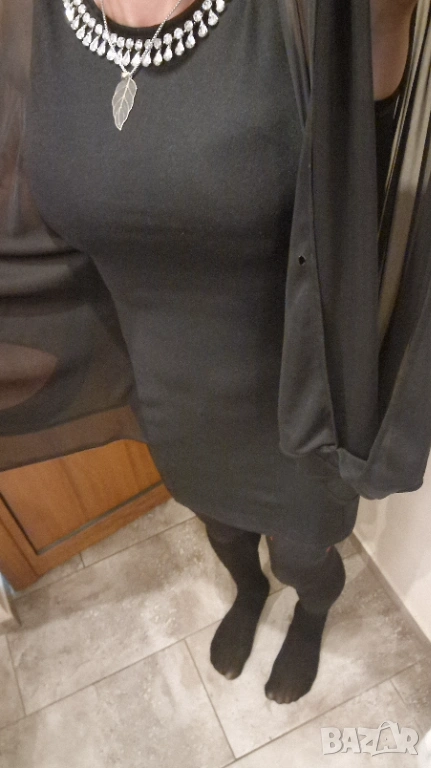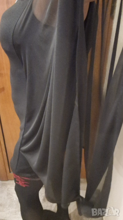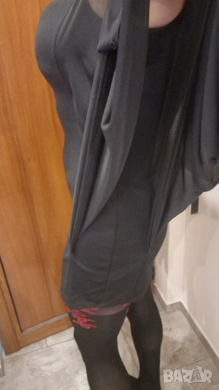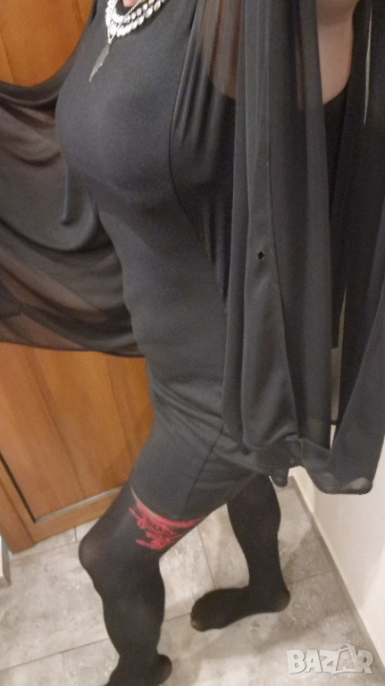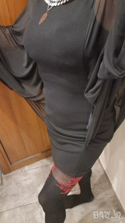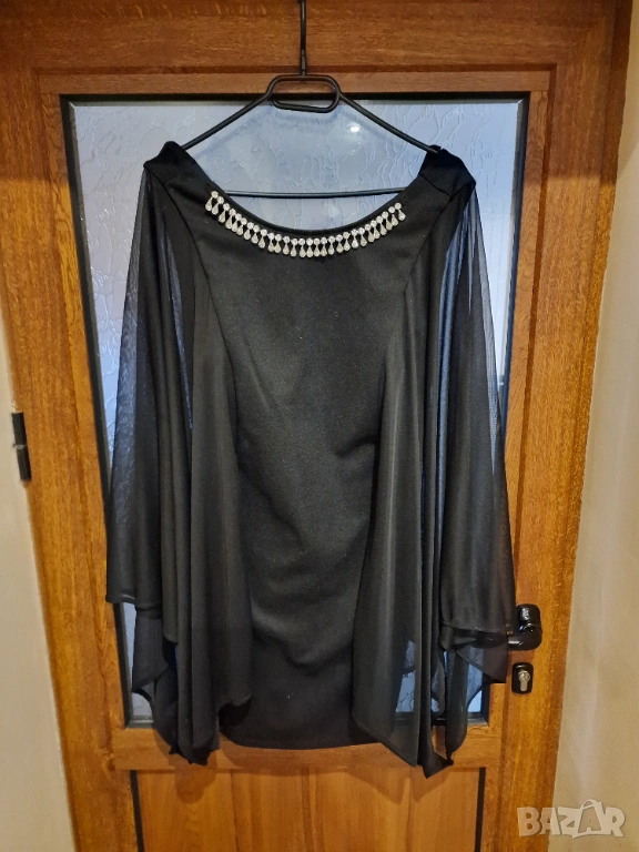 Роклята е много красив модел две в едно. Плътна горна и долна част и ефирни ръкави,които падат като пелерина.Деколтето е украсено с блестящи камъни